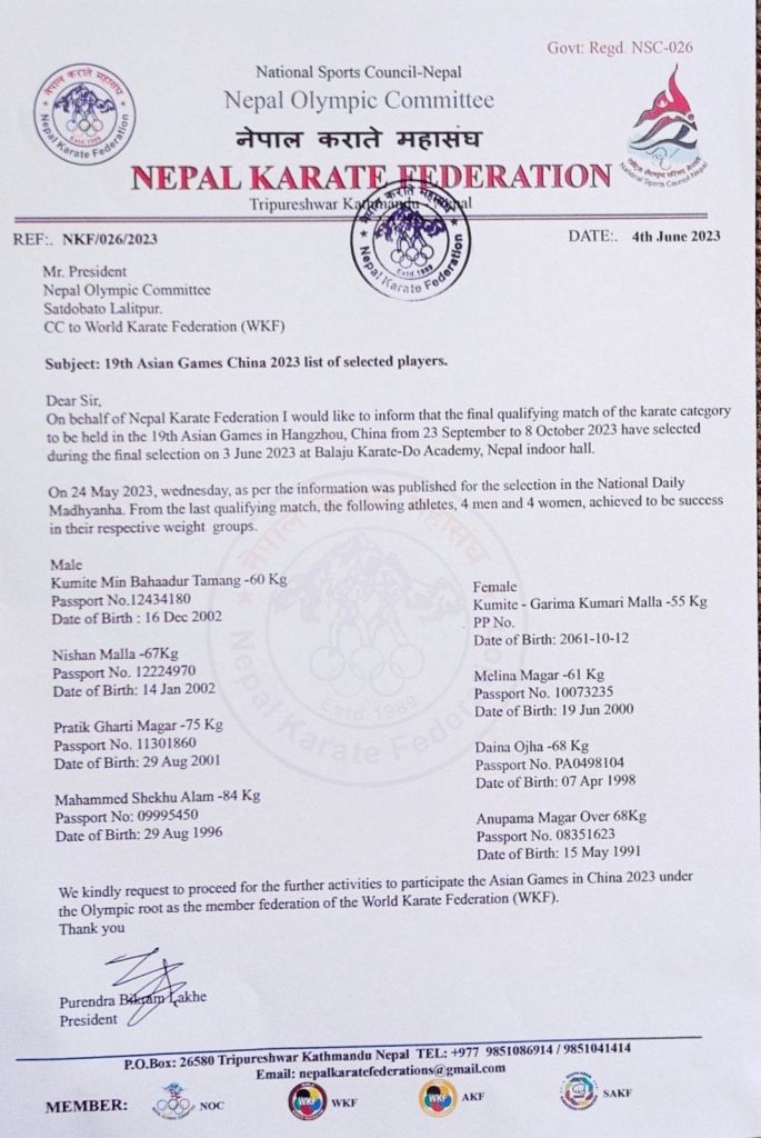 राखेप र नेपाल ओलम्पिक कमिटी (एनओसी) मा समेत अस्तित्वमा नरहेको महासंघका अध्यक्ष लाखेको हस्ताक्षर गरि एनओसीमा एसियाडका लागि खेलाडी छनोट गरेको पत्र बुझाएका छन् । जेठ २० गते बालाजु डोजोमा गरिएको भनिएको छनोटबाट महिलातर्फ गरिमा कुमारी मल्ल (५५ केजी मुनी), मेलिना मगर (६१ केजी मुनी), डायना ओझा (६८ केजी मुनी), अनुपमा मगर (६८ केजी माथि) तथा पुरुषतर्फ मिनबहादुर तामाङ (६० केजी मुनी), निशान मल्ल (६७ केजी मुनी), प्रतिक घर्तीमगर (७५ केजी मुनी) र मोहम्मद शेखु आलम (८४ केजी मुनी) छानिएको जनाएको छ ।