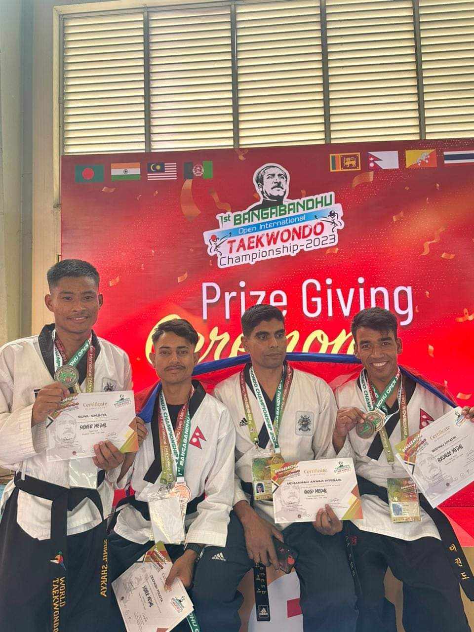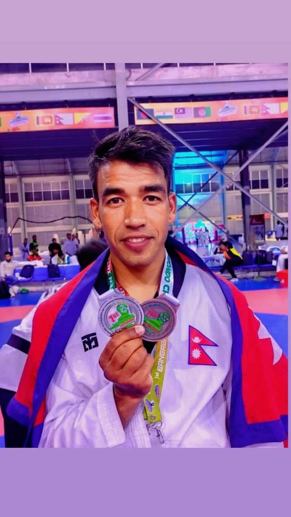 काठमाडौं (हाम्रो खेलकुद) – बंगलादेशमा आयोजित प्रथम बंगबन्धु अन्तराष्ट्रिय खुल्ला तेक्वान्दो प्रतियोगितामा व्यक्तिगत तर्फ बेथानचोकका विष्णु खत्रीले रजत पदक जितेका छन् ।