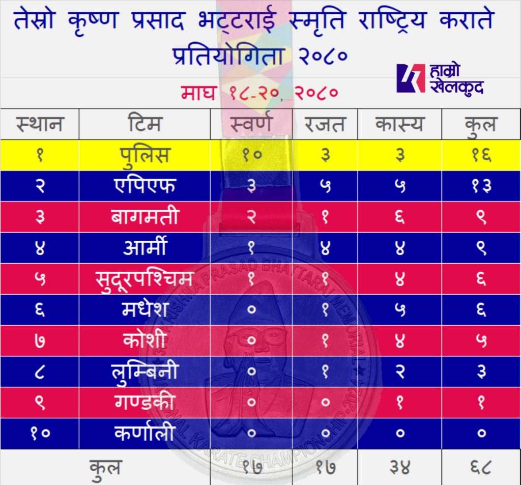 ललितपुर (हाम्रो खेलकुद)– नेपाल पुलिस क्लब तेस्रो कृष्णप्रसाद भट्टराई स्मृति राष्ट्रिय कराते प्रतियोगिताको टिम च्याम्पियन बनेको छ । सातदोबाटोमा स्थिति कराते हलमा शनिबार सम्पन्न प्रतियोगितामा पुलिस १० स्वर्ण पदकसहित च्याम्पियन बनेको हो । पुलिसले समान ३ रजत र कास्य पदक पनि जितेको छ ।
