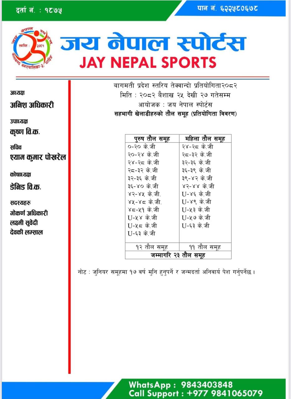 जय नेपाल स्पोर्टस धादिङको आयोजना तथा नेपाल तेक्वान्दो संघ धादिङको र अन्तरराष्ट्रिय धादिङ समाज को सह आयोजनामा बैशाख २५ देखि २७ गतेसम्म धादिङबेसीको व कभर्ड हलमा संचालन हुने बताइएको छ।
