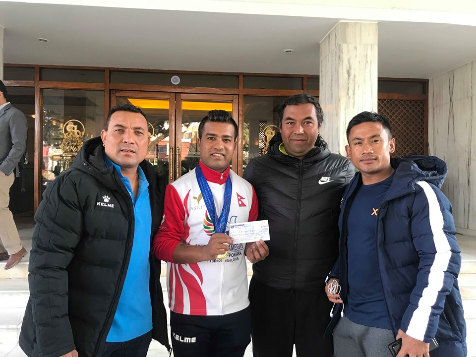 देशका दुई स्वर्ण जितेको भन्दै श्रेष्ठले मण्डेकाजीलाई शुक्रबार प्रोत्साहन स्वरुप ५० हजार रुपैयाँबाट पुरस्कृत गरेका हुन् । उनले मण्डे बस्दै आएको होटल पुगेर चेक हस्तान्तरण गरेका हुन् । मण्डले सोमबार एकल र टिम कातामा स्वर्ण पदक जितेका थिए । जारी १३ औं सागमा दोहोरो स्वर्ण पदक जित्ने मण्डे र तेक्वान्दोकी आयशा शाक्य हुन् ।