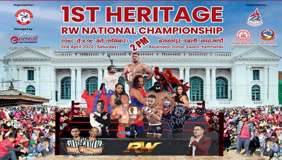 काठमाडौं (हाम्रो खेलकुद) – प्रथम हेरिटेज रिङ रेस्लिङ राष्ट्रिय च्याम्पियनसिपको सम्पूर्ण तयारी भएको आयोजक नेपाल रिङ रेस्लिङ संघले जनाएको छ । च्याम्पियनसिप आउदो शनिबार काठमाडौंको बसन्तपुर डबलीमा हुनेछ ।