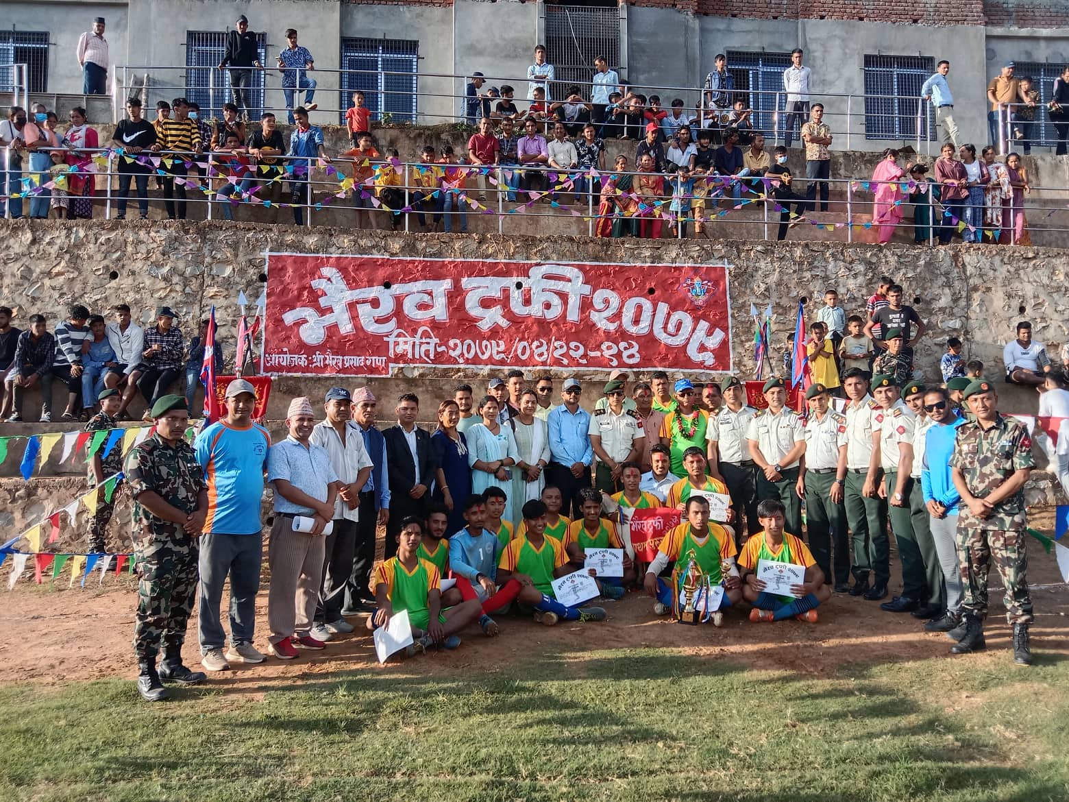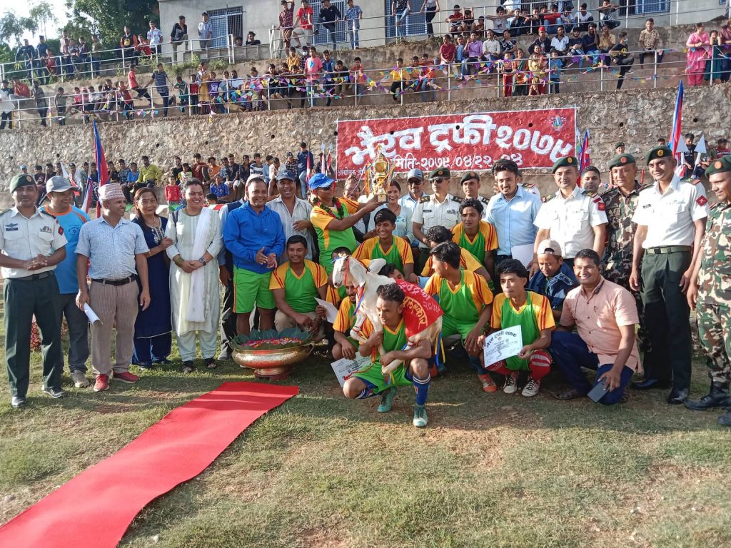 काठमाडौं (हाम्रो खेलकुद) – पूर्व चौकी गाउँपालिकाले भैरव ट्रफी २०७९ फुटबल उपाधि जितेको छ । डोटीको भैरव प्रसाद गण सिलगढी ब्यारकले आयोजना गरेको भैरव ट्रफीको शनिबार फाइनलमा डोटी उद्योग वाणिज्य संघलाई १–० ले हराउँदै पूर्व चौधी गाउँपालिकाले उपाधि जितेको थियो ।