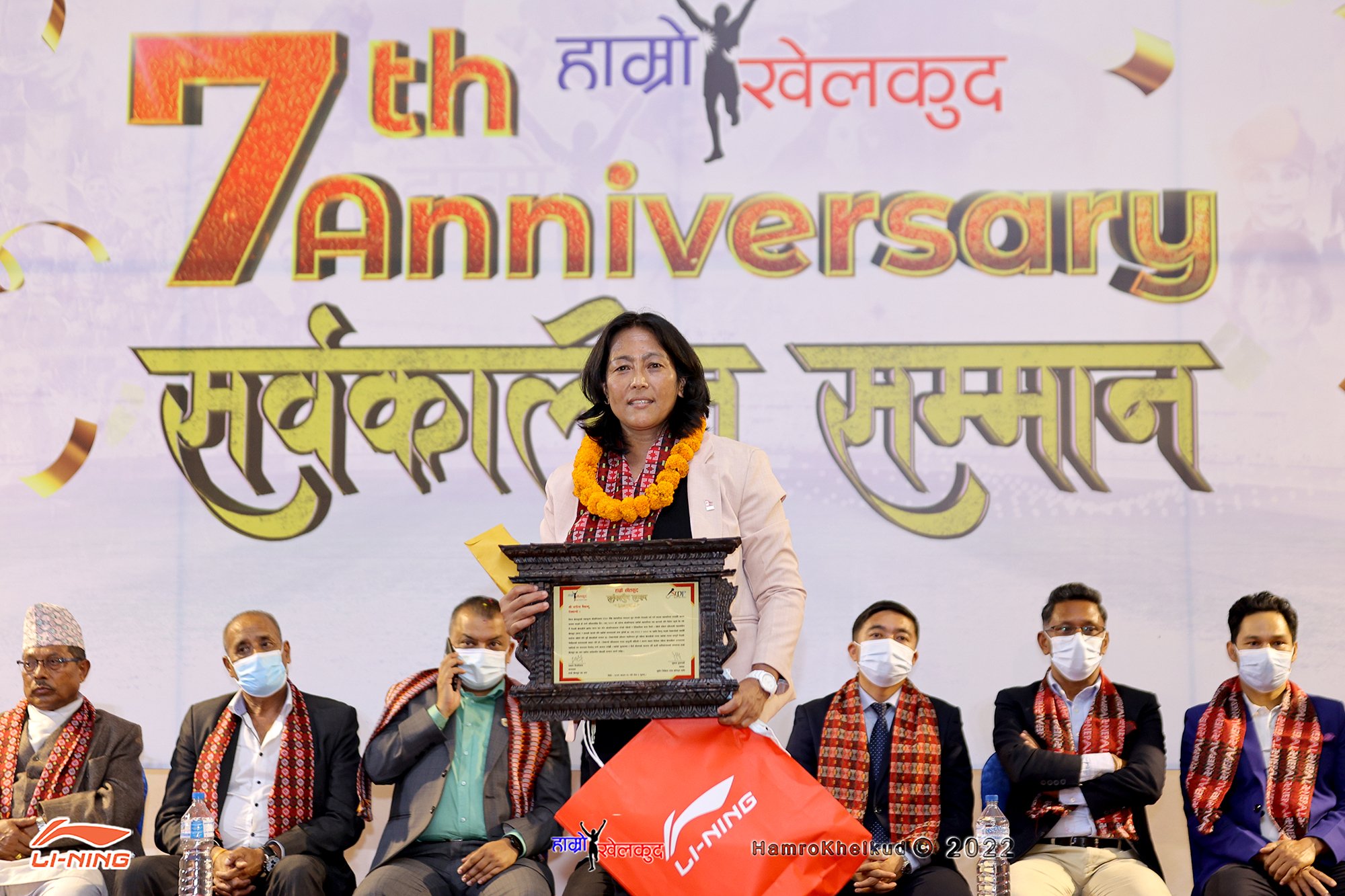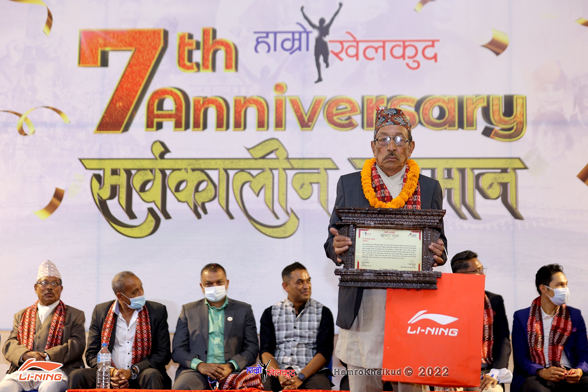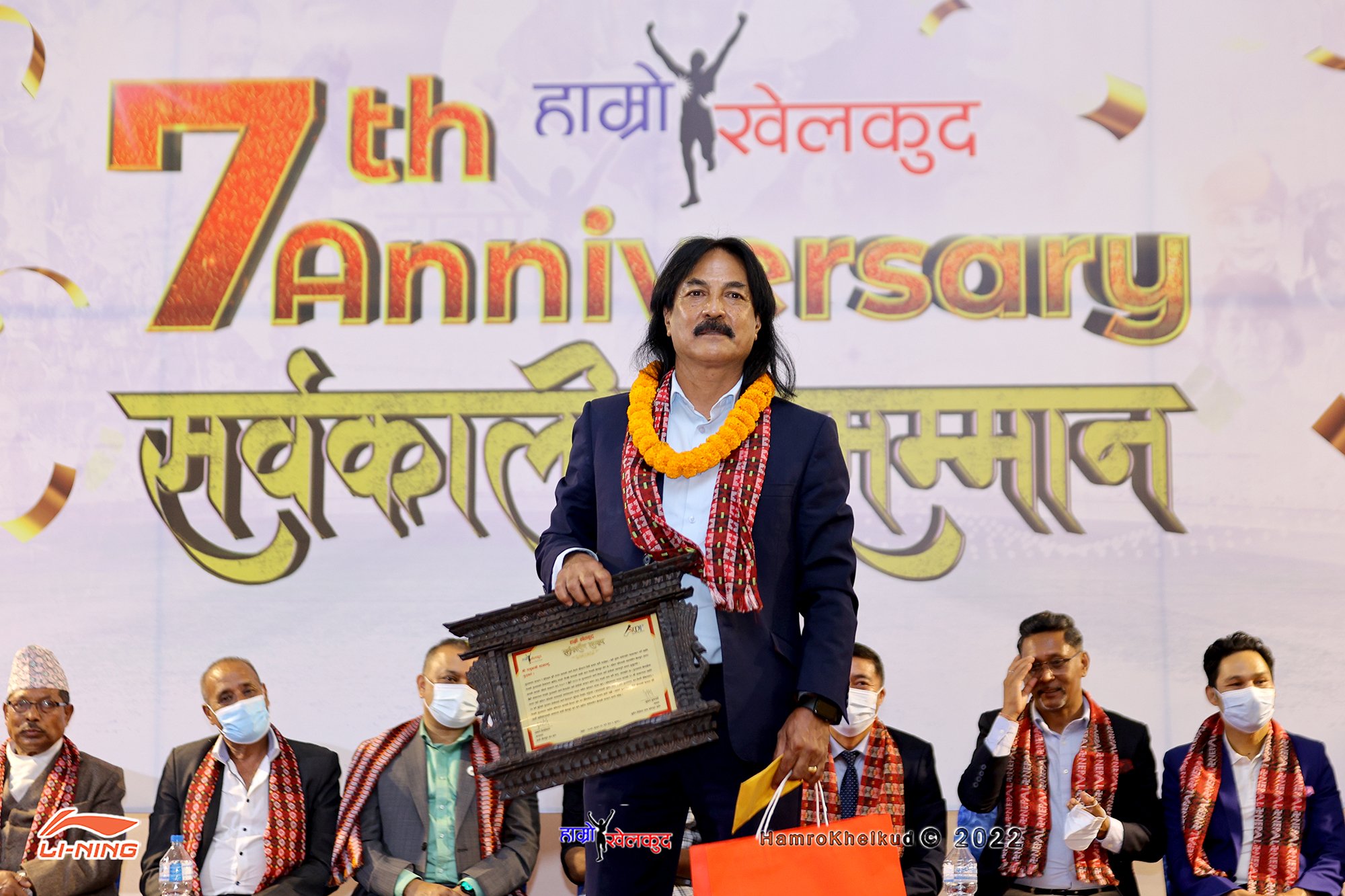 काठमाडौं (हाम्रो खेलकुद)– हाम्रो खेलकुदले आफ्नो सातौं वार्षिकोत्सवमा अवसरमा विहीबार नेपाली खेलकुद इतिहासका सात कालखण्डका शीर्ष खेलाडीलाई हाम्रो खेलकुद सर्वकालीन सम्मान प्रदान गर्यो ।