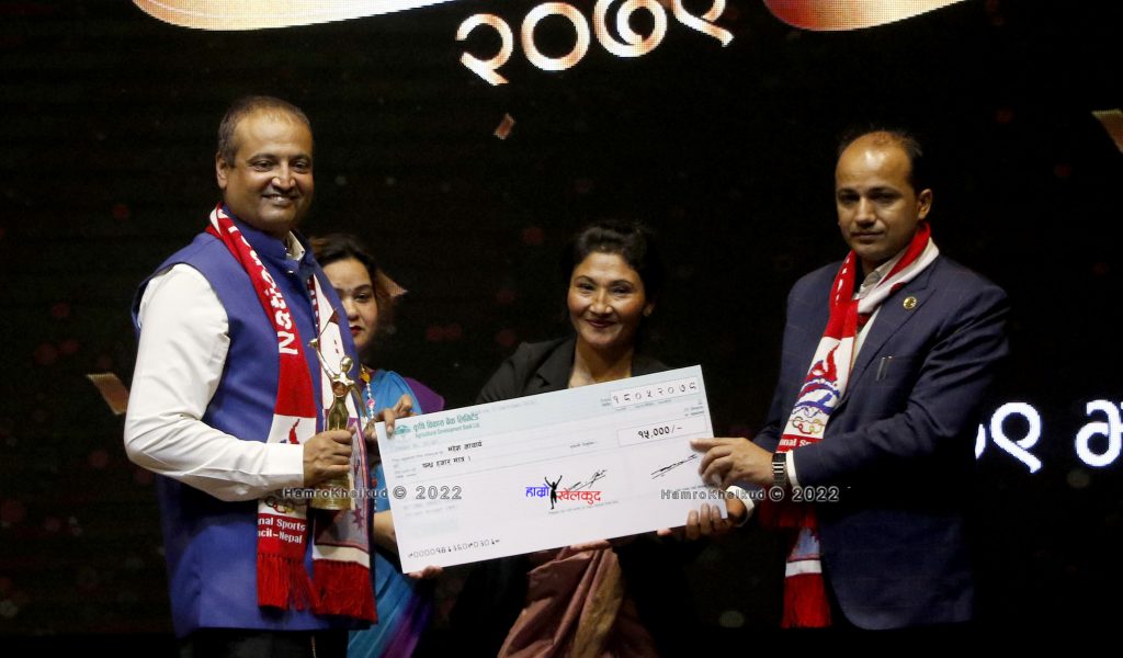 काठमाडौं (हाम्रो खेलकुद)– द हिमालयन टाइम्सका खेलकुद ब्यूरो प्रमुख महेश आचार्य र राष्ट्रिय समाचार समितिकी मुना कार्कीलाई राष्ट्रिय खेलकुद परिषद् (राखेप) ले उत्कृष्ट खेलकुद पत्रकार पुरस्कारबाट सम्मानित गरेको छ ।