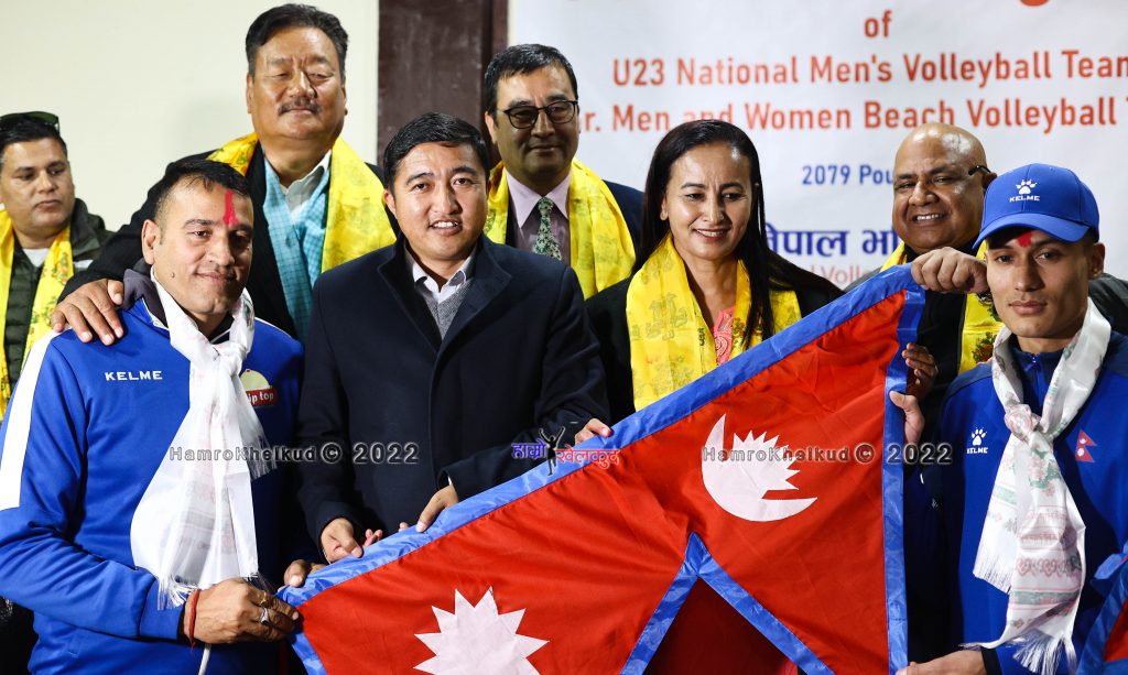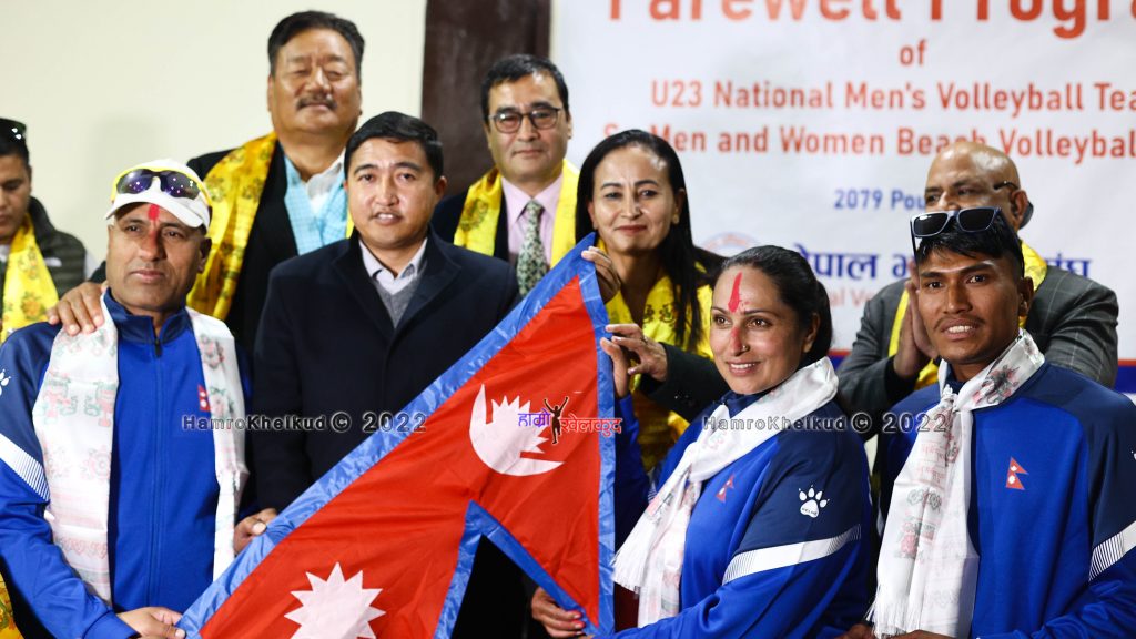 संघले राजधानीमा आइतबार एक कार्यक्रमकाबीच दुवै टोलीलाई संयुक्त रुपमा बिदाई गरेको हो । यू२३ पुरुष भलिबल टोली सोमबार त्यसतर्फ प्रस्थान गर्नेछ । बिच भलिबल टोली झन्डै एक सातापछि प्रस्थान गर्ने तालिका रहेको छ । राष्ट्रिय खेलकुद परिषद (राखेप) का सदस्य सचिव टंकलाल घिसिङ, नेपाल भलिबल संघका अध्यक्ष जितेन्द्र बहादुर चन्द, पुर्व अध्यक्ष मनोरन्जन रमण शर्मा, राखेपका सदस्य जनक बर्तौला, चन्द्र बदना राई, अन्जन धमला, समाजसेवी सावित्री र दुर्ज कुमार राईलगायत टोलीलाई बिदाई गरे ।