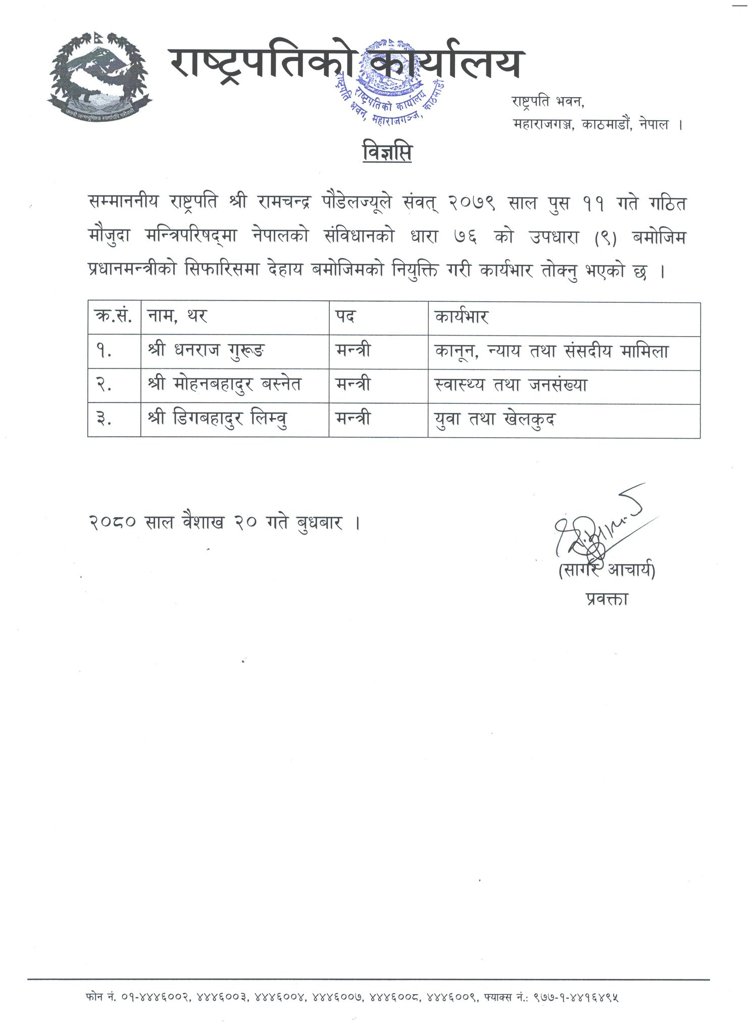 कांग्रेसका धनराज गुरुङ कानुन, न्यान तथा संसदीय मामिला मन्त्री र मोहनबहादुर बस्नेत स्वास्थ्य तथा जनसंख्या मन्त्री नियुक्त भएका छन् । सांसदिय निर्वाचनमा लिम्बु मोरङ क्षेत्र नम्बर १ बाट निर्वाचित भएका थिए ।