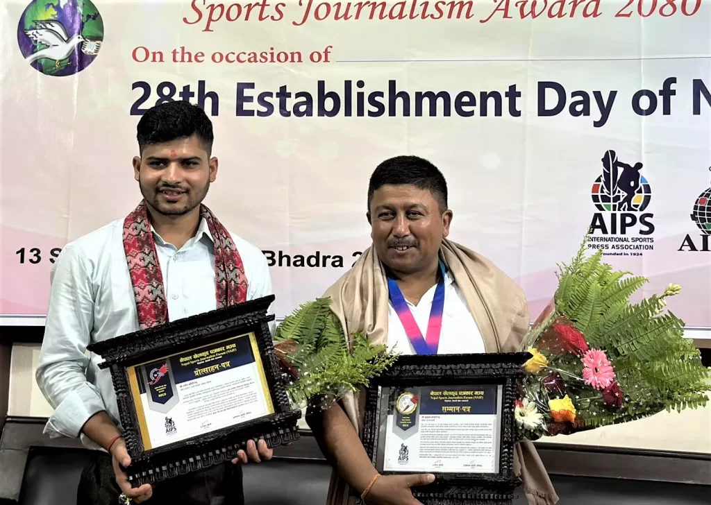 काठमाडौँमा एक कार्यक्रम आयोजना गरि एनएसजेएफले बोगटीलाई सम्मान गर्दा युवा पत्रकार रमेश सुवेदीलाई सुमन भम्जन स्मृति स्पोर्ट्स पत्रकारिता अवार्ड २०८० प्रदान गरेको छ ।