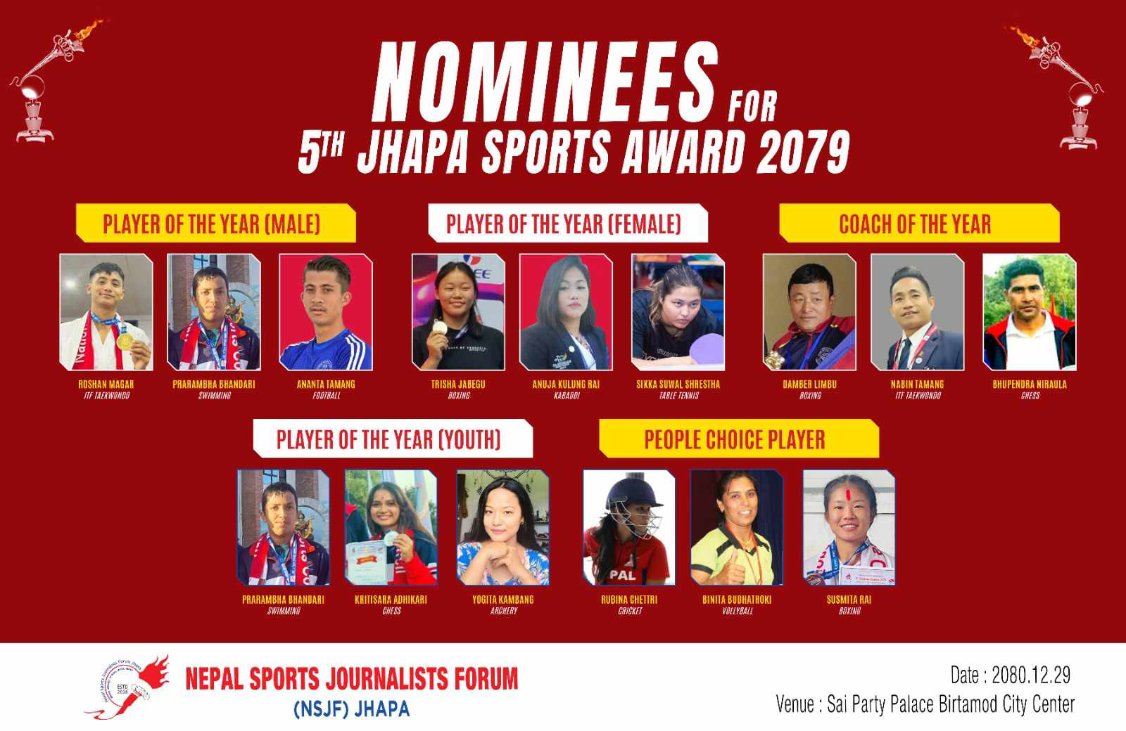 झापा स्पोर्टस् अवार्डको पाँचौँ संस्करणका लागि विभिन्न पाँच विधाका प्रत्येक विधामा समान ३ जना र तीन विधामा छनोट समितिले प्रतिभाको लोकप्रियताको आधारमा समान १ जना सिधै छनोट गरेको प्रतिभा छनोट समितिका संयोजक चिरञ्जीवी घिमिरेले जानकारी दिए ।