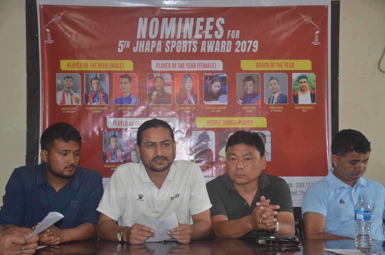नेपाल खेलकुद पत्रकार मञ्च (एनएसजेएफ) जिल्ला समन्वय शाखा झापाले बिहीबार बिर्तामोडमा पत्रकार सम्मेलन गर्दै अवार्डको पाँचौँ संस्करणको मनोनयनमा परेका पाँच विधाका खेल प्रतिभा सार्वजनिक गरेको हो ।