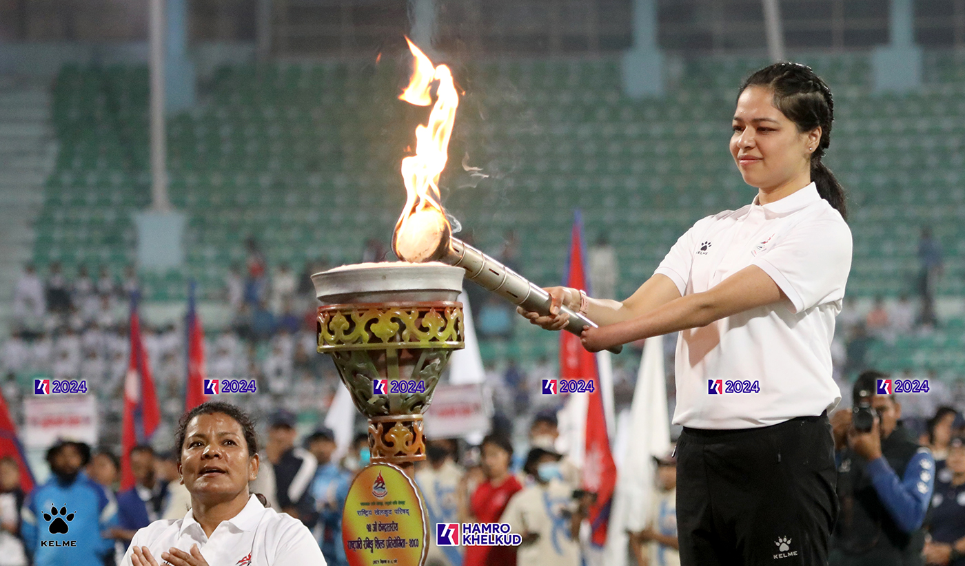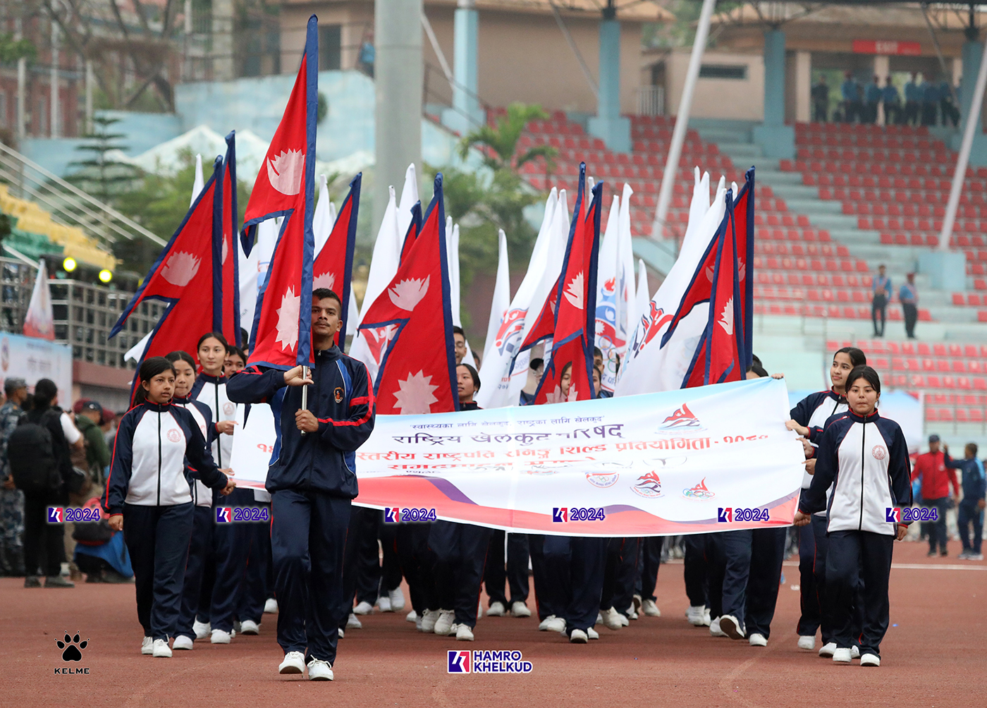 त्यसपछि राष्ट्रपति रनिङ शिल्ड टर्च ओलम्पियनहरू देवु थापा, कमल बहादुर अधिकारी र हरि रिमालले रङ्गशाला परिक्रमा गरी किर्तीमानी पारा ओलम्पियन पलेशा गोवर्धनले दीप प्रज्वलन गरेसँगै औपचारिक रूपमा प्रतियोगिताको उद्घाटन भएको हो। उद्घाटन समारोहमा सातै प्रदेशका खेलाडी, प्रशिक्षक र पदाधिकारीहरू मार्च पासमा सहभागी भए।
