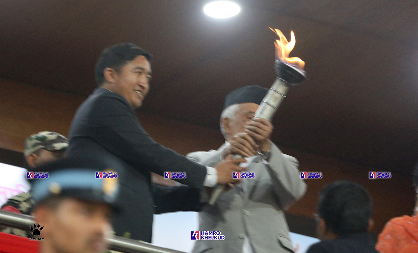 राष्ट्रपति पौडेललाई राष्ट्रिय खेलकुद परिषदका सदस्य सचिव टंकलाल घिसिङले र राष्ट्रपतिले ओलम्पियन देवु थापालाई रनिङ शिल्ड टर्च हस्तान्तरण गरेर प्रतियोगिताको उद्घाटन गरे।