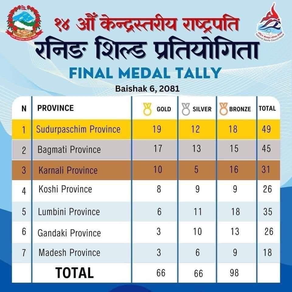 राष्ट्रपति रनिङ सिल्डको उसुमा बागमती टिम च्याम्पियन बन्यो । बागमतीले ५ स्वर्ण, ५ रजत र २ कांस्य पदक जित्यो ।