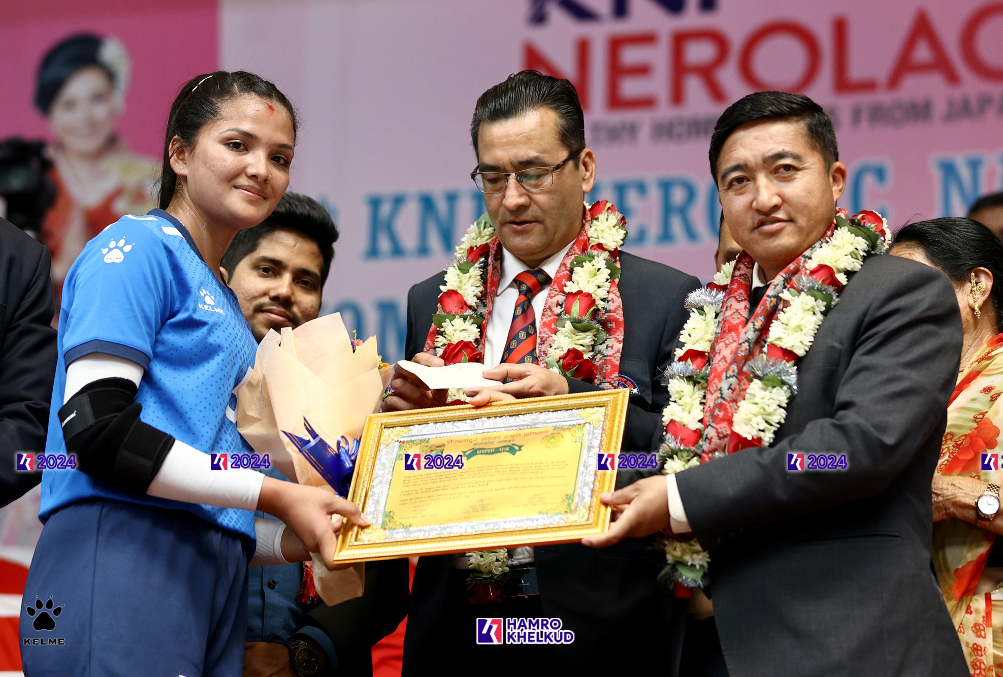 काठमाडौं (हाम्रो खेलकुद) – राष्ट्रिय भलिबल टोली तथा नेपाल पुलिस क्लबकी भलिबल खेलाडी पुनम चन्दलाई स्पेशल अवार्डबाट सम्मानित भएकी छन् । शेरबहादुर खड्का स्मृती प्रतिष्ठानको आयोजनामा बुधबार सुरु भएको सातौं केएनपी नेरोलेग महिला भलिबल प्रतियोगिताको उद्घाटनका दौरान पुनमलाई सम्मान गरिएको हो ।