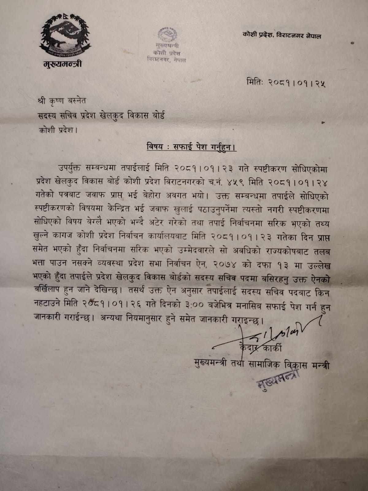 स्पष्टीकरणको जवाफ चित्तबुझ्दो नदिएको जनाउँदै कोशी प्रदेशका मुख्यमन्त्री केदार कार्कीले खेलकुद विकास बोर्ड कोशी प्रदेशका सदस्य सचिव कृष्ण बस्नेत (पर्शुराम) लाई सफाइ पेश गर्न अर्को पत्र पठाएका छन् ।