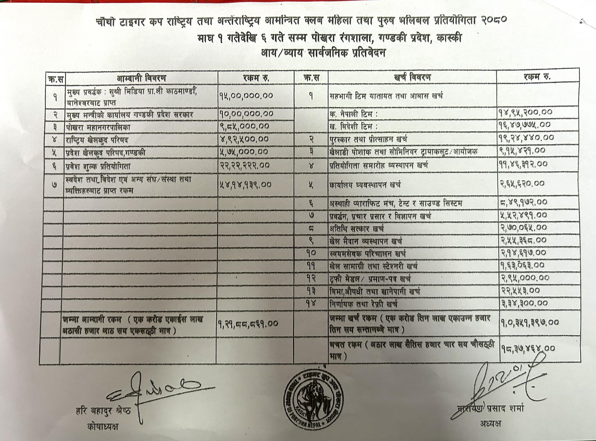 आयोजक टाइगर ग्रुप अफ पोखरा नेपालले सोमबार पत्रकार सम्मेलन गर्दै प्रतियोगिताको आय–व्यय सार्वजनिक गर्दै १८ लाख ३७ हजार ४ सय ६४ रुपैयाँ बचत भएको जानकारी दिएको हो ।