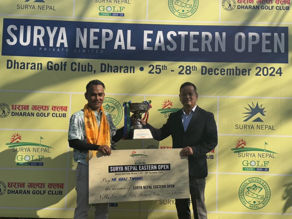 काठमाडौं (हाम्रो खेलकुद)- निरज तामाङले शुक्र बहादुर राईको कुल स्कोरको रेकर्ड बराबरी गर्दै १७-अन्डर १९३ को सानदार स्कोरमा सूर्य नेपाल इस्टर्न ओपनको उपाधि जितेका छन्।