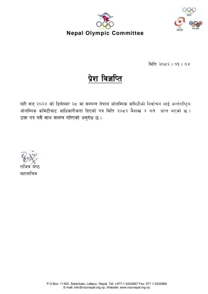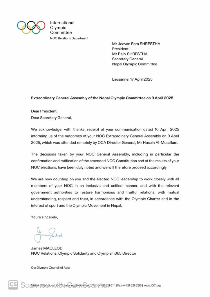 आइओसीका एनओसी रिलेसन्स, ओलम्पिक सोलिडारिटी तथा ओलम्पिक ३६५ डाइरेक्टर जेम्स म्याकलियोडले एनओसीका अध्यक्ष जीवनराम श्रेष्ठ र महासचिव राजीव श्रेष्ठलाई सम्बोधन गरेर बिहीवार पठाएको पत्रको आधारमा एनओसीले यस्तो दाबी गरेको हो।