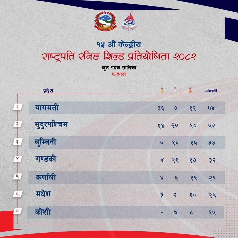 युवा तथा खेलकुद मन्त्रालयको तत्वावधान तथा राष्ट्रिय खेलकुद परिषद् (राखेप) को आयोजनामा भएको प्रतियोगितामा गत संस्करणको च्याम्पियन सुदूरपश्चिम प्रदेश दोश्रो भयो ।