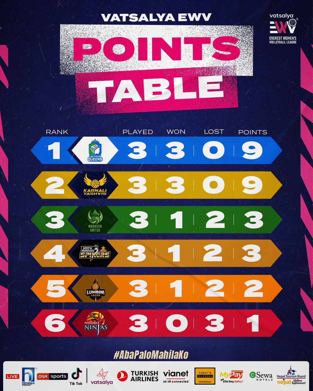 ललितपुर क्विन्स र कर्णाली यशविजले समान ३ खेल जित्दै समान ९ अंक जोडेका छन्। मधेश युनाइटेड र काठमाडौं स्पाइकर्सले समान ३ अंक, लुम्बिनी लाभाजले २ अंक र पोखरा निन्जाजको अंक छ। लिग चरणमा सबै टोलीले समान ३ खेल खेलिसकेपछि स्थगित भएको थियो।