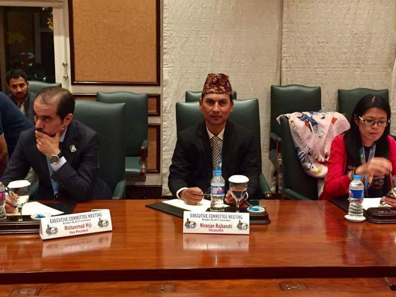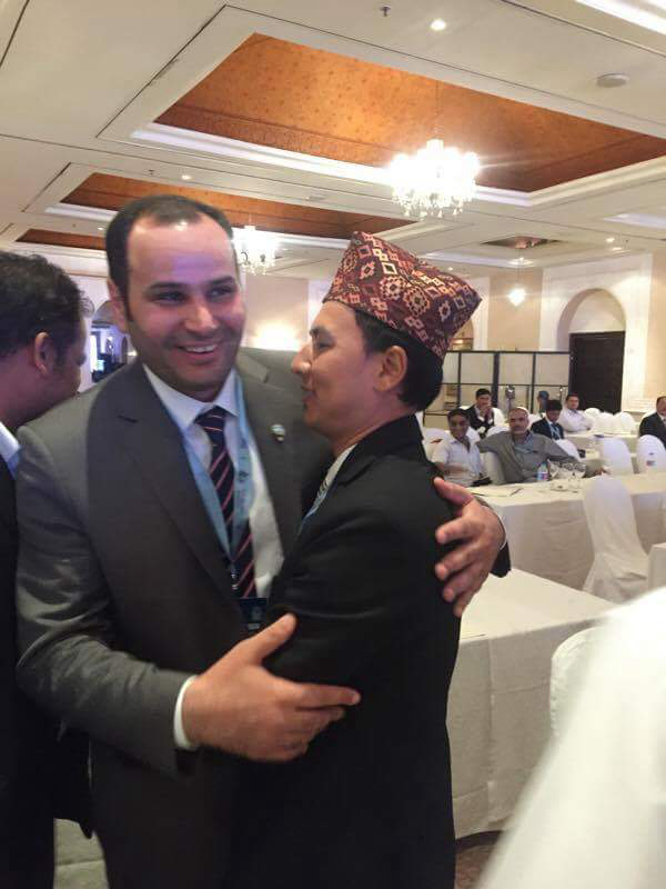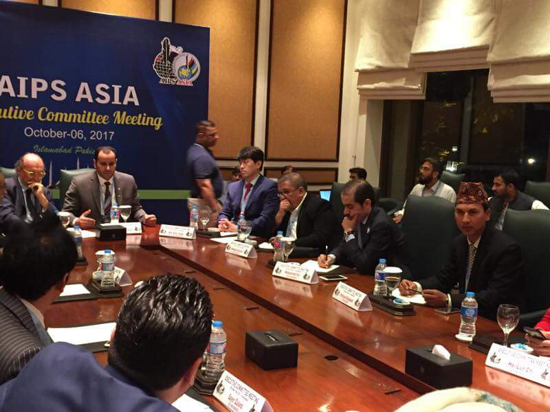एआइपिएस एसियाको कोषाध्यक्षमा पुनः निर्वाचित नेपाल खेलकुद पत्रकार मञ्चका पूर्व अध्यक्ष निरञ्जन राजवंशी (दायाँ) का साथ मञ्चका महासचिव प्रकाश तिमल्सिना पाकिस्तानको इस्लामावादमा भएको विशेष साधारण सभामा भाग लिदै ।