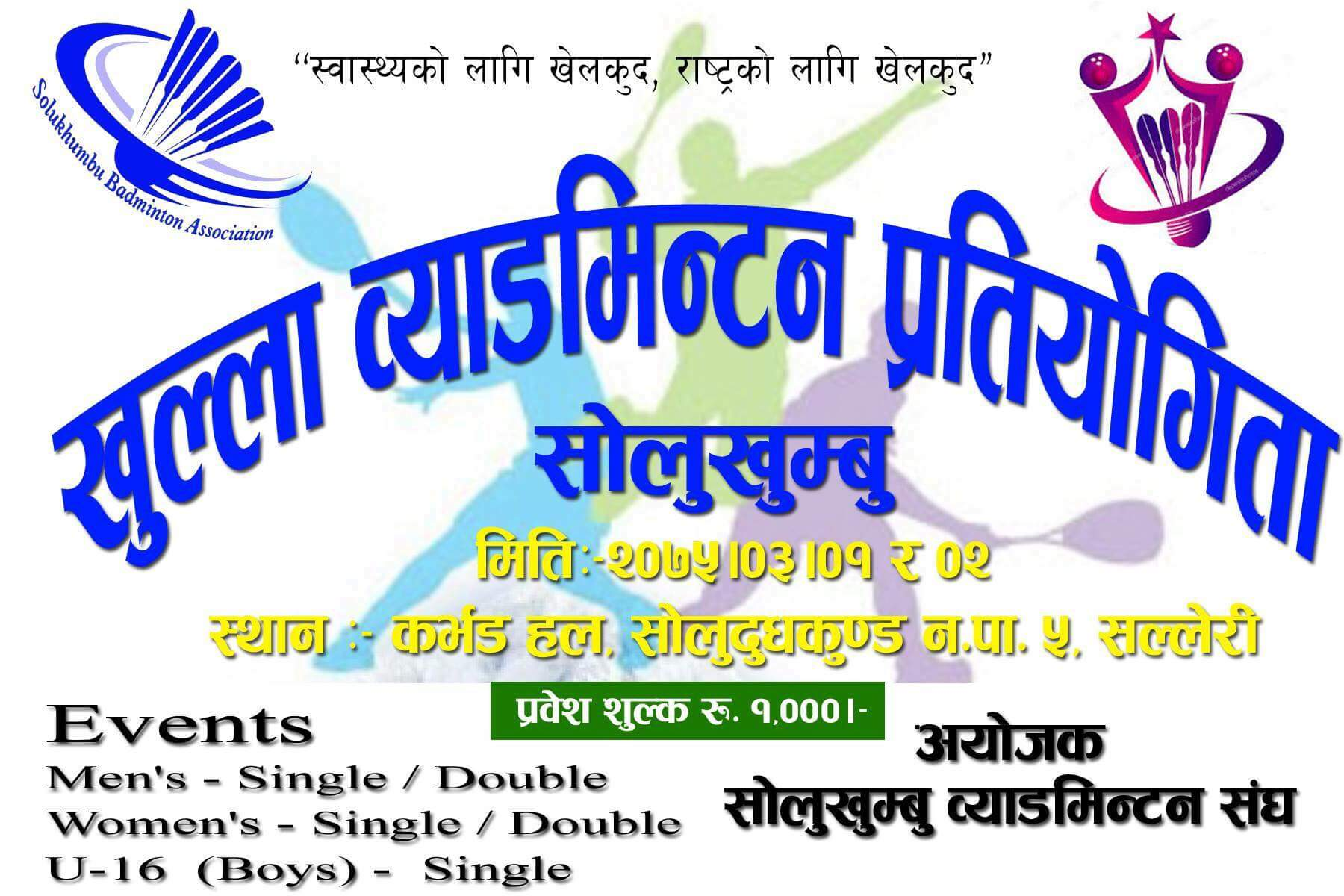 काठमाडौं (हाम्रो खेलकुद) – सोलुखुम्बु जिल्ला ब्याडमिन्टन संघको आयोजनामा असारको पहिलो साता खुला ब्याटमिन्टन प्रतियोगिता हुने भएको छ । ६ इभेन्ट्समा हुने प्रतियोगिता असार १ र २ गते हुने जिल्ला संघका अध्यक्ष राजकुमार गुरुङले जानकारी दिएका छन् ।