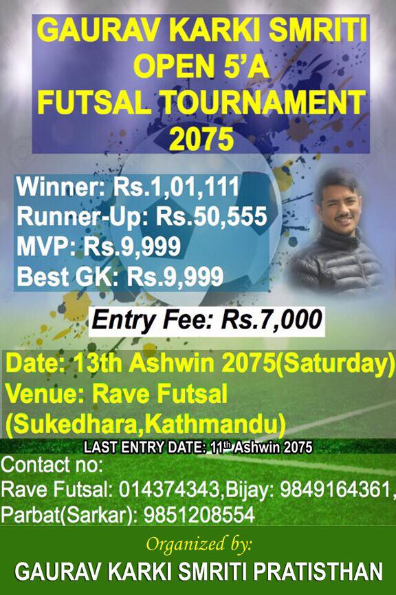 काठमाडौं (हाम्रो खेलकुद)– गौरव कार्की स्मृति प्रतिष्ठानको आयोजनामा यसै साता खुला फाइभ ए साइड फुटसल प्रतियोगिता आयोजना हुने भएको छ ।