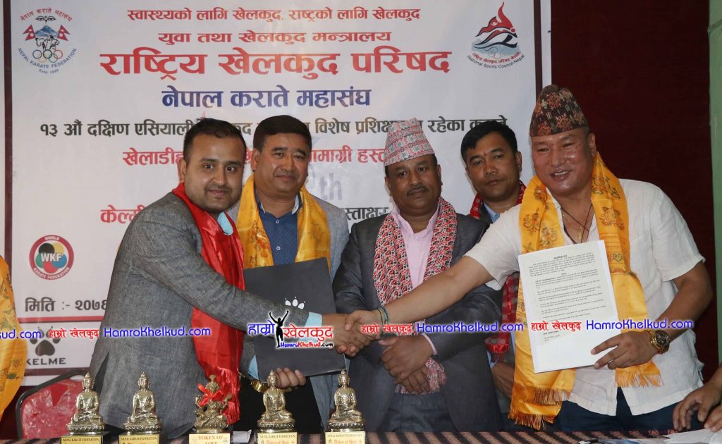 केल्मी नेपालले कराते टोलीलाई २ बर्षको लागि खेलकुद सामग्री प्रायोजन गरेको हो । नेपाल कराते महासंघ र केल्मीको नेपालमा आधिकारिक विक्रेता कामारु ट्रेडिङ प्रालिबीचमा शुक्रबार सम्झौता भएको छ ।