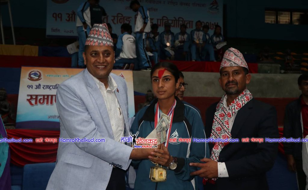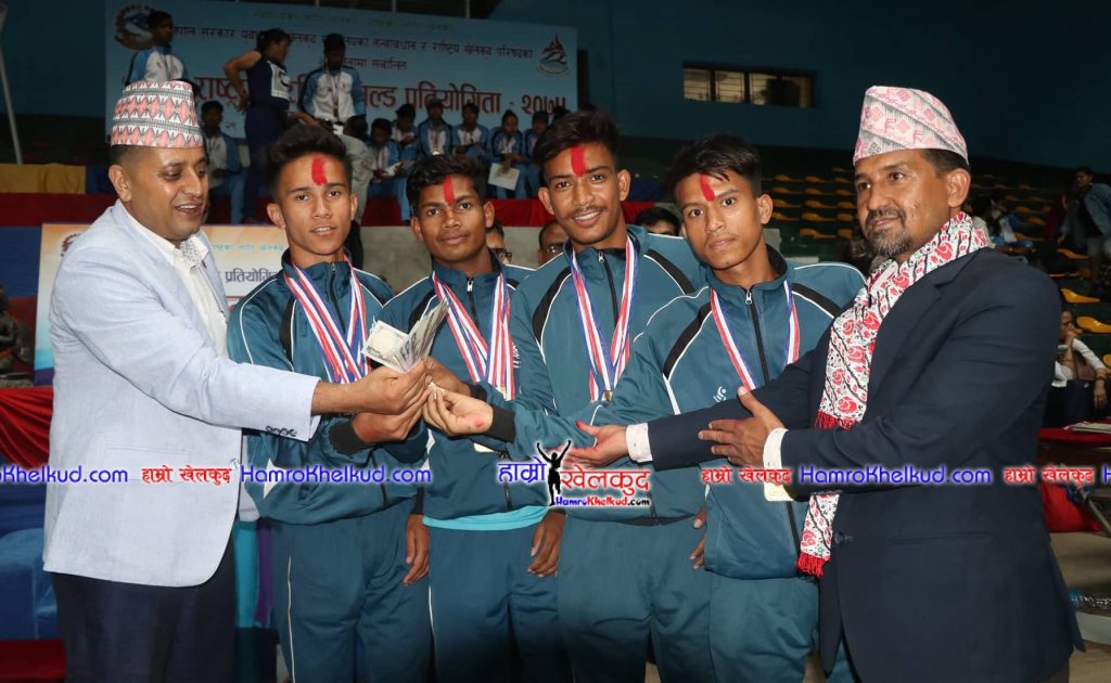 व्यक्तिगत स्पर्धामा शीर्ष तीन स्थान हात पार्ने खेलाडीहरुले क्रमशः ५ हजार, ४ हजार र ३ हजार नगद पुरस्कार पाए । टिममा पहिलोदेखि तेश्रो हुने खेलाडीलाई क्रमशः २ हजार ५ सय, २ हजार र १ हजार ५ सय नगद पुरस्कार हात पा¥यो । छात्रको ४ गुणा ४ सय मिटर रिलेमा प्रदेश ५ का सिमान पाण्डे, लेखनाथ महर, बेदबहादुर ओली र श्रवन केवतले तथा छात्राको ४ गुणा ४ सय मिटर रिलेमा प्रदेश ५ का अरुणा रिजाल, पुर्णिमा खड्का, पूजा चौधरी र करुणा रिजालले नयाँ जुनियर कीर्तिमान बनाएबापत् थप १० हजार रुपैया पाए ।