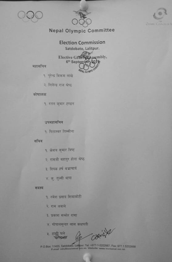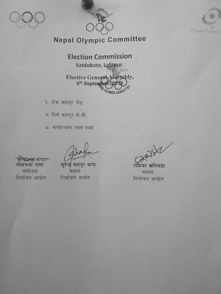 यसैबीच १९ सदस्यीय एनओसी कार्यसमितिका लागि २ पदाधिकारी निर्वारोध निर्वाचत भएका छन् । एनओसीका कोषाध्यक्ष रतन तण्डनले फेरि सोही पदमा उम्मेदवारी दिदा उनलाई चुनौति दिने अर्को निस्केनन् । त्यस्तै राखेपका उपाध्यक्ष पिताम्बर तिम्सिना पनि उप महासचिवमा बाजी मारेका छन् । त्यो पदमा पनि उनको बाहेक उम्मेदवारी परेन । पहिलो पटक एनओसीको साधारण सभामा भाग लिनेले सदस्यबाहेक उप महासचिव र सचिवमा मात्र उम्मेदवारी दिन पाउने वैद्यानिक व्यवास्था छ ।