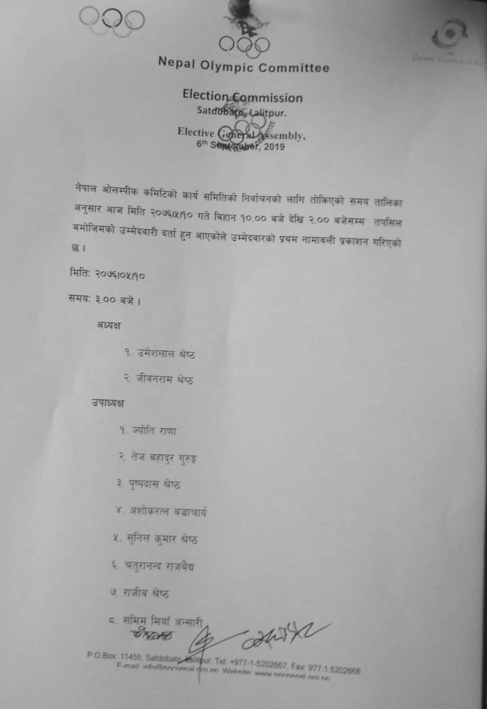 लन टेनिसका ज्योति राणा, सुटिङका पुष्पदास श्रेष्ठ, पौडीका अशोकमान बज्राचार्य, ह्यान्डबलका तेज गुरुङ, टेबल टेनिसका चतुरानन्द राज वैद्य, फेन्सिङका सुनिल श्रेष्ठ, र्याफटिङ एन्ड क्यानोइङका राजीव श्रेष्ठ, कुस्तीका समिम मिया अन्सारीले उम्मेदवारी दिएका छन् ।