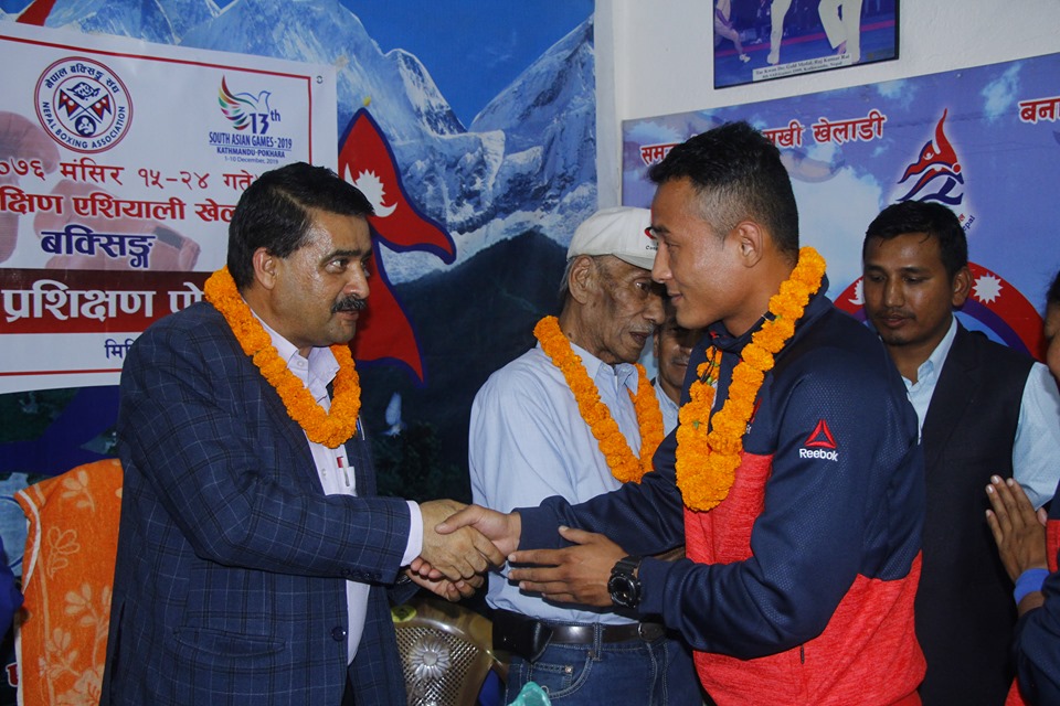 काठमाडौं (हाम्रो खेलकुद) –स्वदेशमा आयोजना हुने १३औं दक्षिण एसियाली खेलकुद ९साग० को लागि बक्सिङको बन्द प्रशिक्षण पोखरामा हुने भएको छ । बन्द प्रशिक्षणमा पोखरा जाने बक्सिङ टोलीलाई आइतबार राखेप सदस्यसचिव रमेशकुमार सिलवाल, नेपाल बक्सिङ संघका अध्यक्ष राम अवाले तथा संघका पदाधिकारीहरुले बिदाई गरे ।