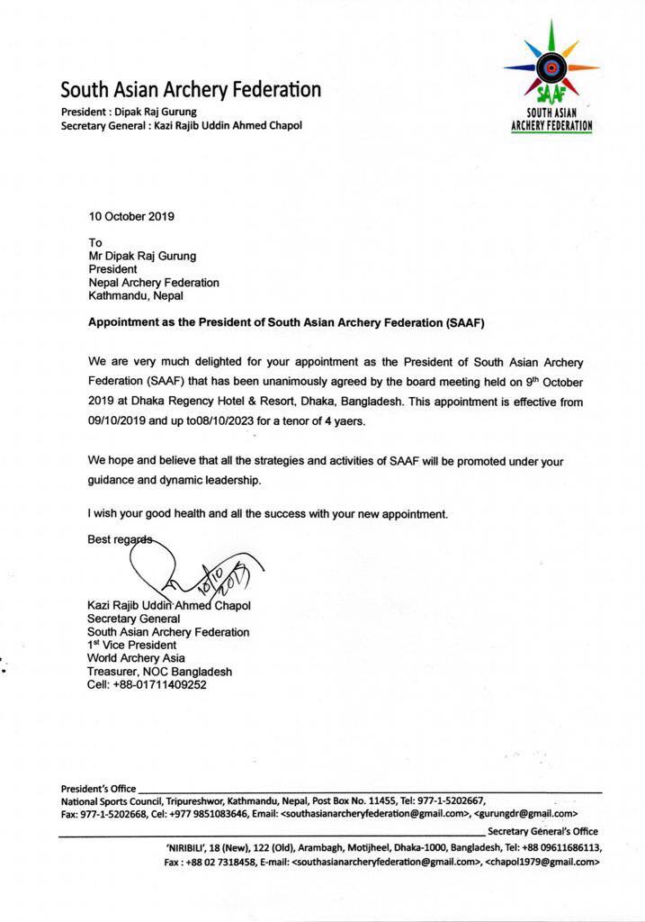 गुरुङ एक साताअघि नै अध्यक्षमा चयन भएको बुधबार साफले जारी गरेको विज्ञप्तीमा उल्लेख छ । साफका महासचिव एवंम् विश्व आर्चरी एसियाका प्रथम उपाध्यक्ष तथा बंगलादेश ओलम्पिक कमिटिका कोषाध्यक्ष काजी राजीव उद्दिन एहमेद चपोलले गुरुङको अध्यक्षतामा दक्षिण एसियामा आर्चरीको गतिविधि बढ्ने र सफल कार्यकालको शुभकामना व्यक्त गरेका छन् ।