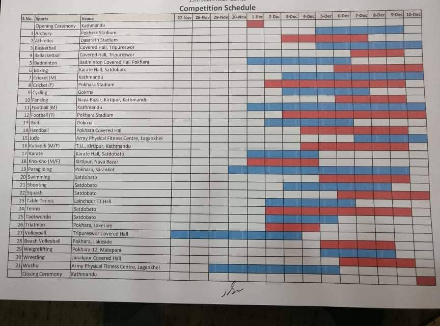 काठमाडौं (हाम्रो खेलकुद)– मुख्य आयोजना थलो दशरथ रंगशालाको पूर्ननिर्माण सम्पन्न नभएपनि अर्को महिना आयोजना हुने १३ औं दक्षिण एसियाली खेलकुद (साग) को औपचारिक उद्घाटनको चार दिनअघि बाट केहि खेल सुरु हुने खेल तालिका तयार भएको छ । १३ औं साग मंसिर १५ देखि २४ गते सम्म काठमाडौं र पोखरामा आयोजना हुँदैछ । सागको प्रतिस्पर्धा तालिका अनुसार भलिबल, उसु र शंकामा रहेको प्याराग्लाडिङ मंसिर १५ गते अघि नै सुरु गर्ने तय भएको छ ।