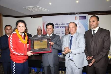 काठमाडौं (हाम्रो खेलकुद)- बंगलादेशमा भर्खरै सम्पन्न एभिसी सेन्ट्रल जोन महिला भलिबल च्याम्पियनसिपको उपाधि जित्न सफल महिला भलिबल टिमलाई राष्ट्रिय बाणिज्य बैकले सोमबार सम्मान तथा बधाई ज्ञापन गरेको छ । बाणिज्य बैकका कार्यकारी अधिकृत किरण कुमार श्रेष्ठले खेलाडीहरुलार्य माला तथा मायाको चिनो सहित टिमलाई कदरपत्रद्वारा सम्मान गरेका थिए ।