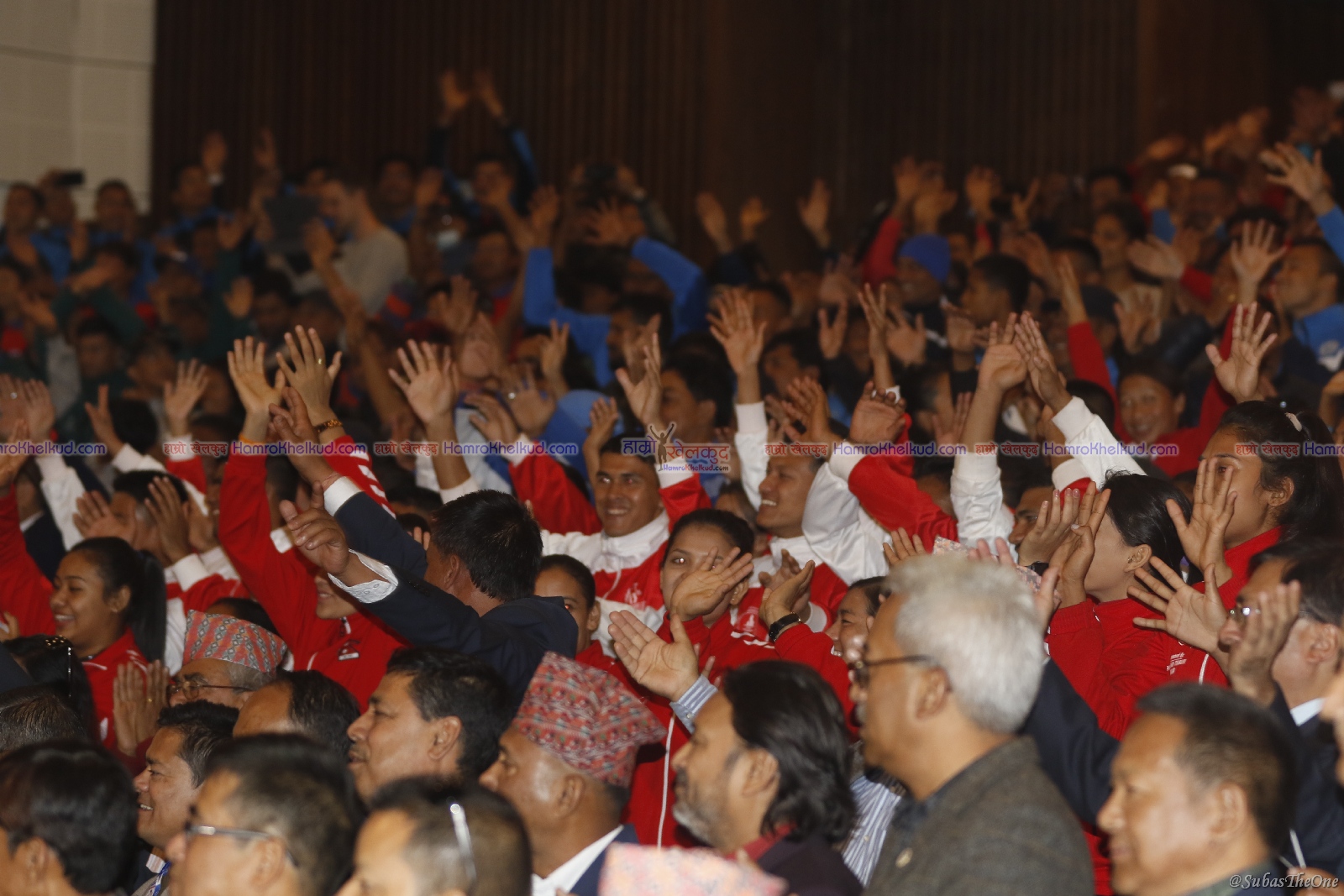 प्रधानमन्त्रीका तर्फबाट अर्थमन्त्री युवराज खतिवडाले सम्बोधान गरेका थिए । उनले नेपाल सरकारले यसअघि नै निर्धारण गरेको पुरस्कार राशीमा उल्लेखनिय बृद्धि हुने बताएपनि रकम भने तोकेनन् । सागका स्वर्ण पदक विजेताले ३ लाख, रजत विजेनाले २ लाख र कास्य पदक विजेताले १ लाख रुपैयाँ दिने नियमावलीमा उल्लेख छ ।