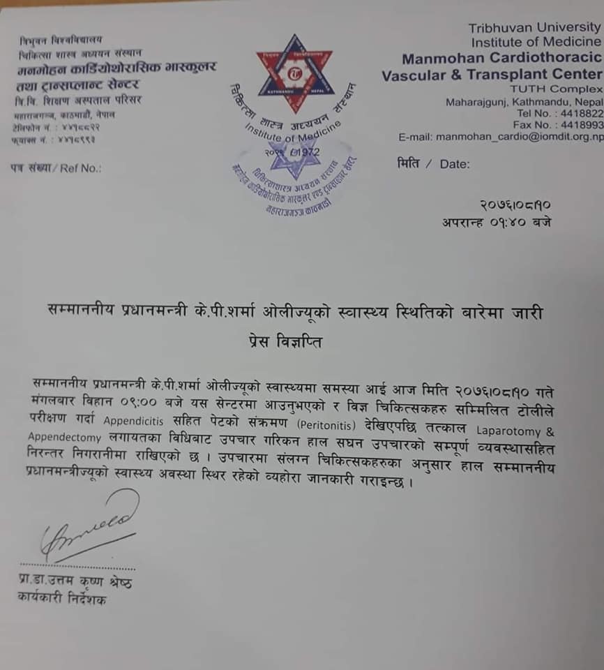 प्रधानमन्त्रीको सघन उपचार भइसकेको र अहिलेको स्वास्थ्य अवस्था स्थित रहेको मनमोहन कार्डियो थोरासिक भास्कुलर तथा ट्रान्सप्लान्ट सेन्टरले दिउँसो १ः४० बजे प्रेस विज्ञप्तीमार्फत जानकारी दिएको छ । उनमा एपेन्डिसाइटिससहित पेटको सक्रमण देखिएको जनाएको छ ।