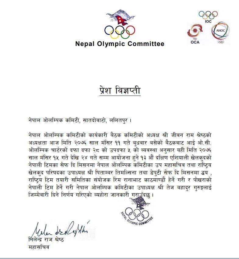 काठमाडौ (हाम्रो खेलकुद)– दक्षिण एसियाली खेलकुद (साग) को १३ औं सस्करण सुरु हुन ४ दिनमा मात्र बाँकी रहँदा राष्ट्रिय खेलकुद परिषद् (राखेप) का उपाध्यक्ष पिताम्बर तिम्सिना नेपाली टोलीका सेभ द मिसन तोकिएका छन् । नेपाल ओलम्पिक कमिटी (एनओसी) का आफ्ना उप महासचिव समेत रहेका तिम्सिनालाई बुधबारको बैठकमा उक्त जिम्मा दिएको हो ।