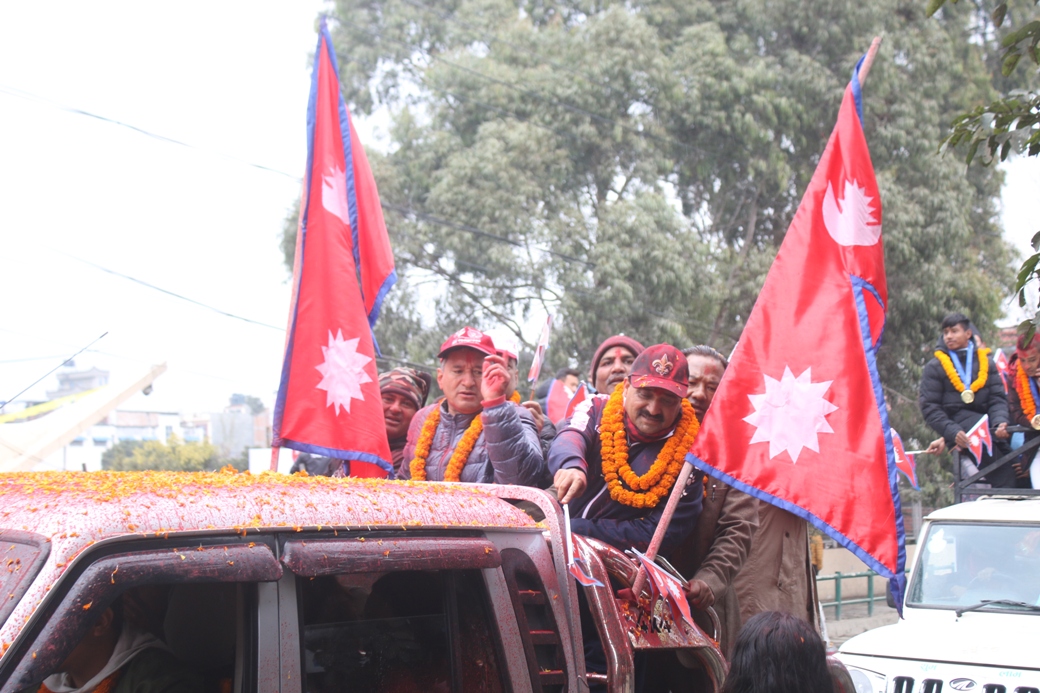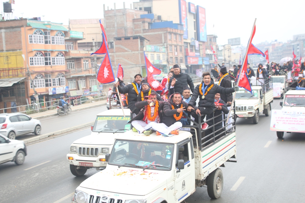काठमाडौं (हाम्रो खेलकुद) – १३ औं दक्षिण एसियाली खेलकुद (साग) मा पदक जित्न सफल नेपाली खेलाडीलाई शुक्रबार नगर परिक्रमा गराइएको छ । शुक्रबार बिहान ११ बजेदेखि नै पदक विजेताको सम्मानमा राष्ट्रिय खेलकुद परिषद् (राखेप) ले खेलाडीलाई नगर परिक्रमा गराउने तयारी गरेपनि झरीका कारण केहीवेर प्रभावित बनेको थियो ।