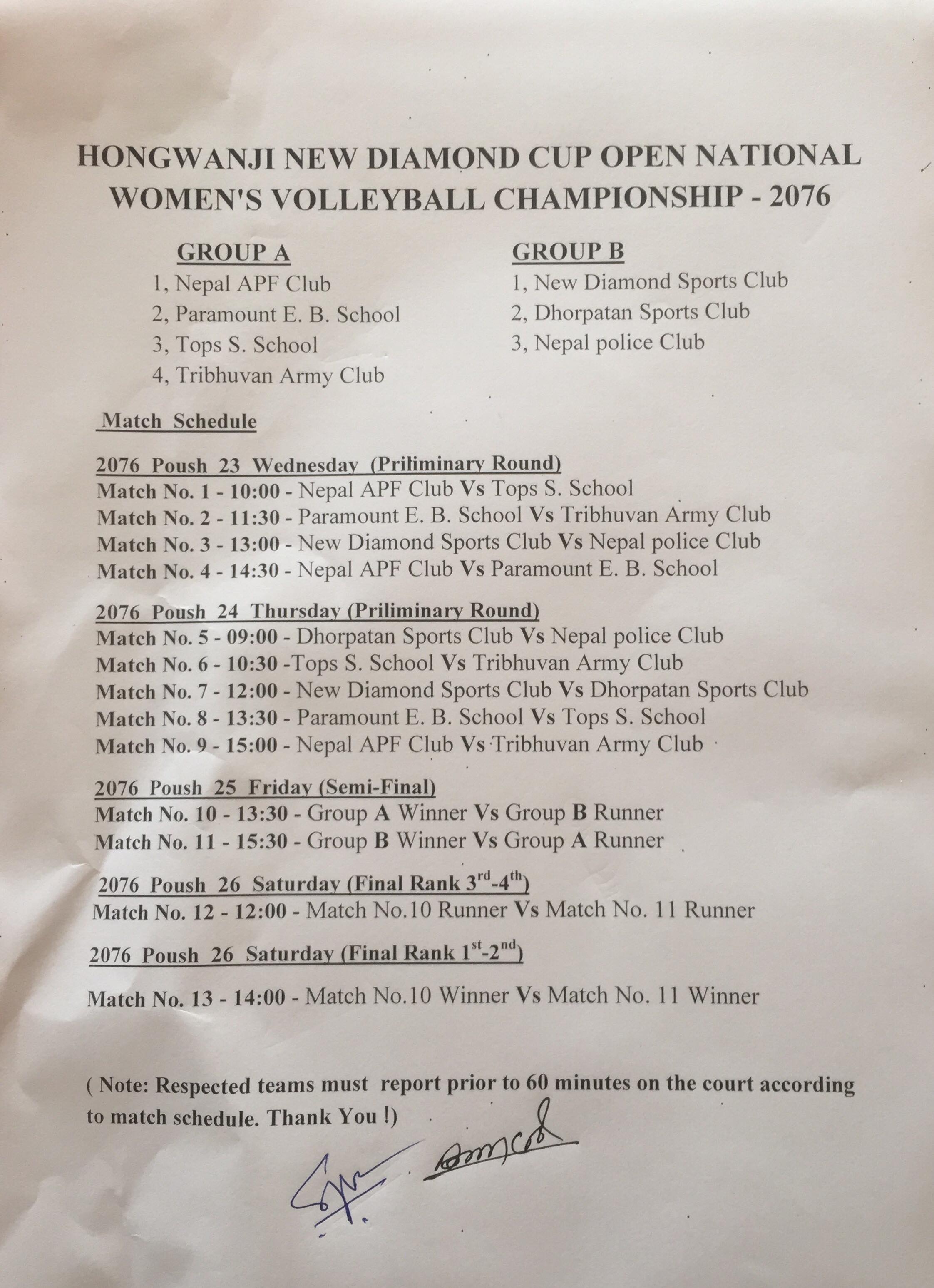 आयोजक न्यु डायमण्ड क्लबले मंगलबार राखेको टेक्निकल बैठकमा खेल तालिका सार्वजनिक हुँदा एपिएफ, आर्मीका साथ समूह ‘ए’मा पारामाउन्ड इङ्लिस बोडिङ स्कुल र पोखराको टप्स माविक रहेका छन् । त्यस्तै समूह ‘बी’मा आयोजक एवंम् साविक उप विजेता न्यु डायमण्ड स्पोर्टस क्लबसहित ढोरपाटन स्पोर्टस् क्लब र नेपाल पुलिस क्लब रहेका छन् ।