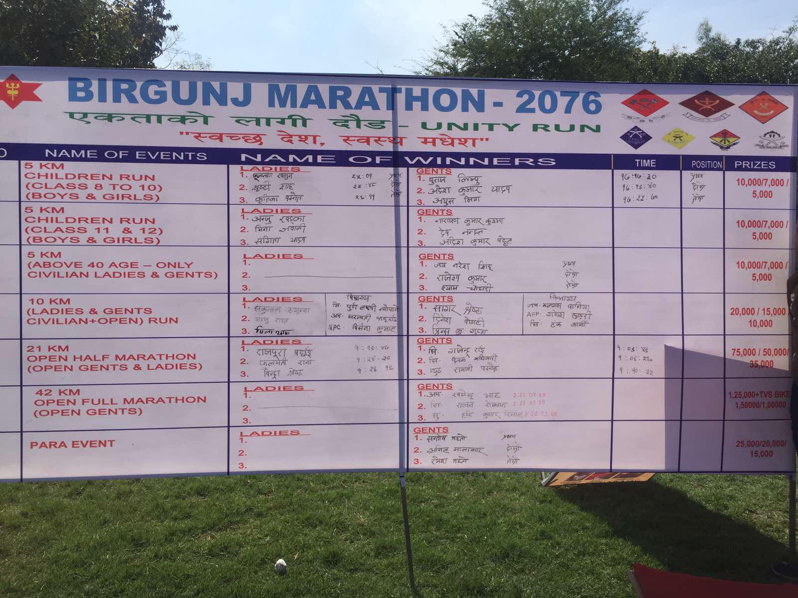 म्याराथनका विजेतालाई प्रदेश २ का मुख्य मन्त्री लालबाबु राउत, नेपाली सेनाका प्रधानसेनापति पूर्णचन्द्र थापालगायतले पुरस्कृत गरे ।