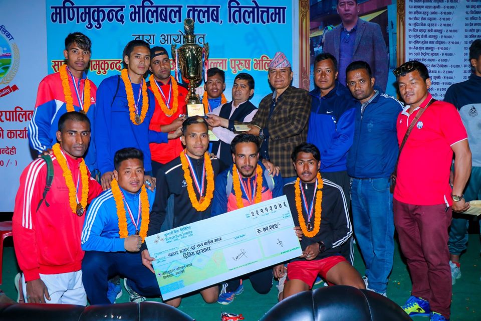 बिहीबार राति तिलोत्तमा २ देवकोटा पथ शंकरनगरस्थित मणिमुकुन्द भलिबल कोर्टमा भएको खेलमा स्याङ्जालाई ३–१ को सेटमा पराजित गर्दै बाग्लुङले उपाधि जितेको हो । स्याङ्जामा सन्जुविक्रम शाह, हरि पाण्डे, कमल सुनार, योकेन्द्र गुरुङ, राजन दर्लामी मगर जस्ता नाम चलेका खेलाडी रहेपनि बाग्लुङसँग पराजित हुन पुग्यो ।