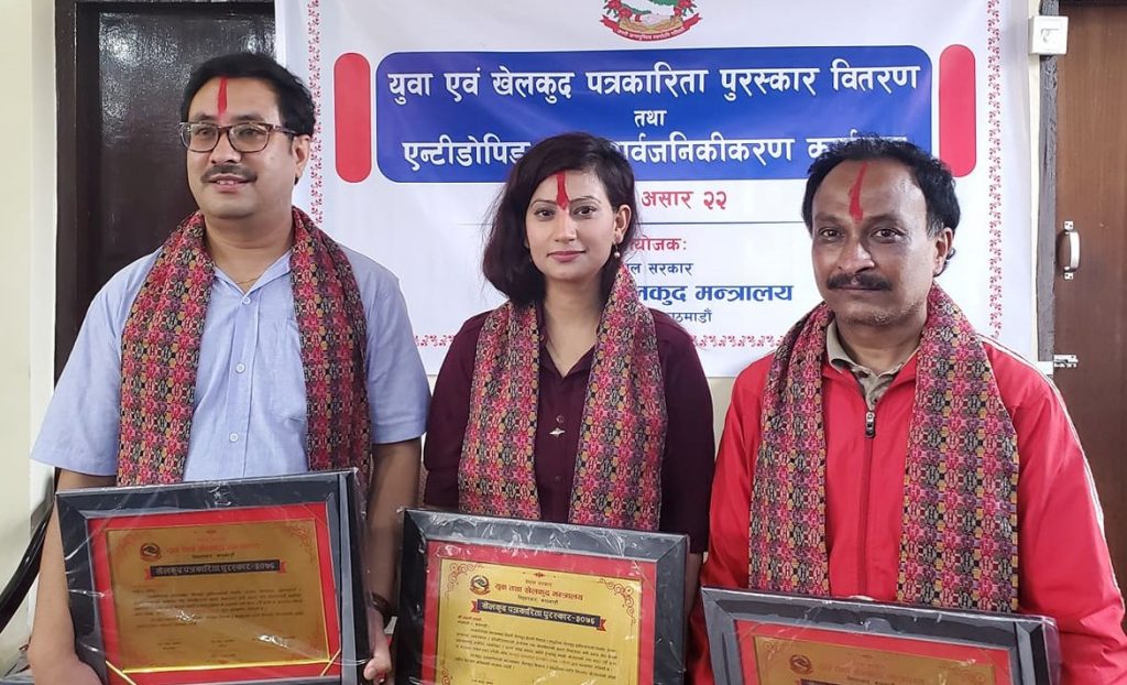 अन्य खेल पत्रकारमा पोखराका केशव पाठक र नेपाल टेलिभिजनकी प्रियालक्ष्मी कार्की रहेकी छिन् । मन्त्रालयले सोमबार चारजनालई जनही ५० हजारसहित पुरस्कृत गरेको हो ।