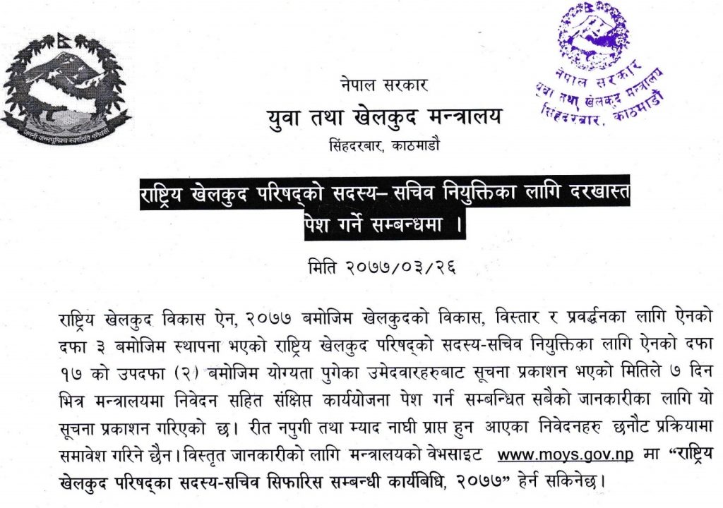 काठमाडौं (हाम्रो खेलकुद) – युवा तथा खेलकुद मन्त्रालयले राष्ट्रिय खेलकुद परिषद् (राखेप) को नयाँ सदस्य सचिवका लागि दरखास्त आव्हान गरेको छ । खेलकुद विकास ऐन २०७७ को प्रावधान अनुसार मन्त्रालयले शुक्रबार सुचना जारी गर्दै सदस्य सचिवका लागि दरखास्त आव्हान गरेको हो ।