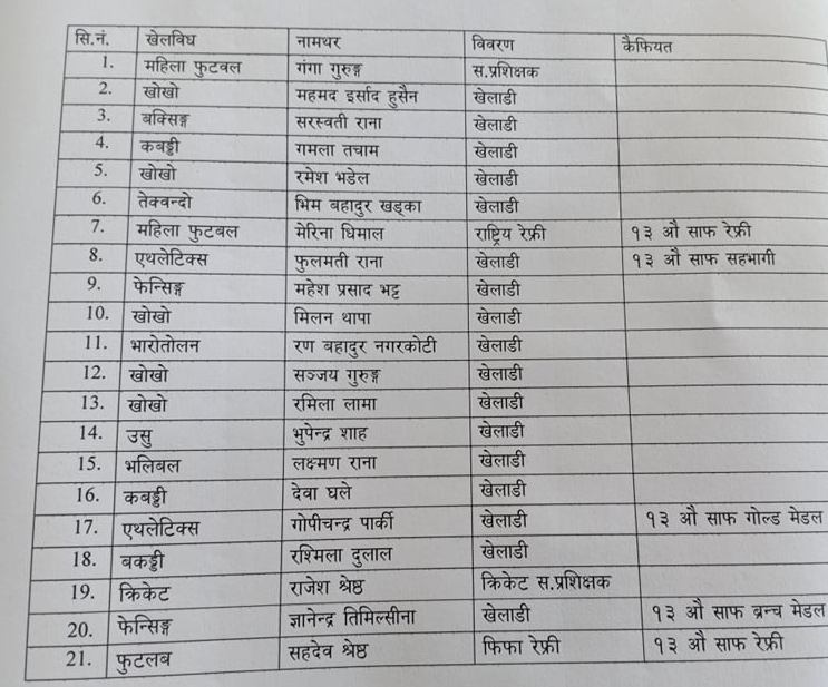 गोपीचन्द्रसहित सागमा कास्य पदक जित्ने फेन्सिङका ज्ञानेन्द्र तिमिल्सना र सहभागी एथलेटिक्सकी फुलमती राना छिन् । त्यस्तै सागमा रेफ्रीको भूमिका निर्वाह गर्ने सहदेव श्रेष्ठ र मेरिना धामी पनि बढुवा भएका हुन् । शसस्त्र प्रहरी उपरिक्षक तुलसीराम दहालले उनीहरुर्लाइ बुधबार दर्जान्ही चिन्ह प्रदान गरेका थिए ।