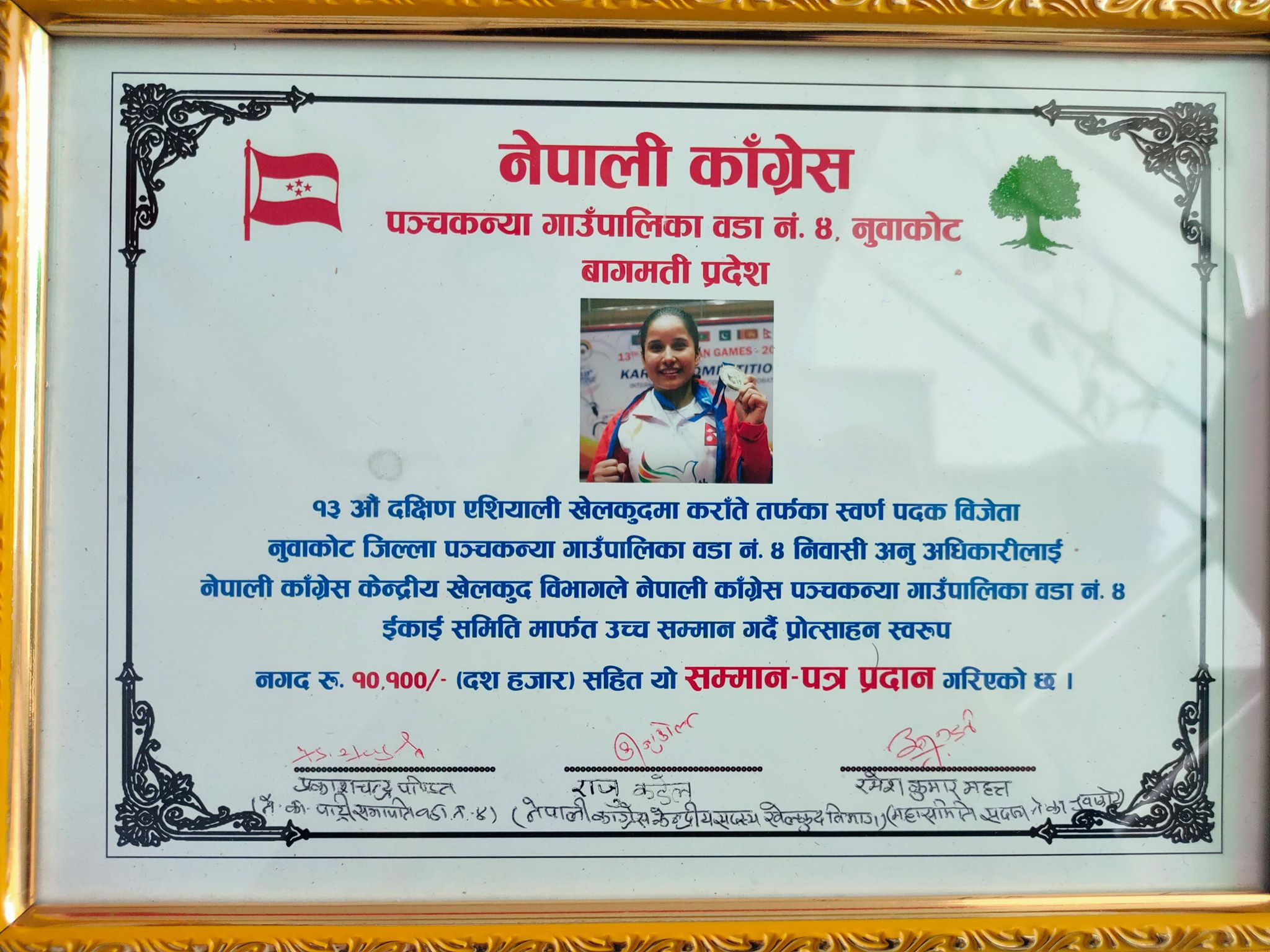 अनु पन्चकन्याकी स्थायी बासिन्दा हुन् । कांग्रेस खेलकुद विभागका सदस्य राजु कडेलले शनिबार काठमाडौंमा अनुलाई सम्मान पत्र हस्तान्तरण गरेका थिए । गत वर्ष मंसिरमा स्वेदशमा आयोजना भएको १३ औं सागमा अनुले करातेको कुमुतेमा स्वर्ण पदक जितेकी थिइन् । कांग्रेसको खेलकुद विभागले केहि दिन अघि पत्रकार सम्मेलन गर्दैै सागका स्वर्ण पदक विजेतालाई सम्मान गर्ने घोषणा गरेको थियो ।