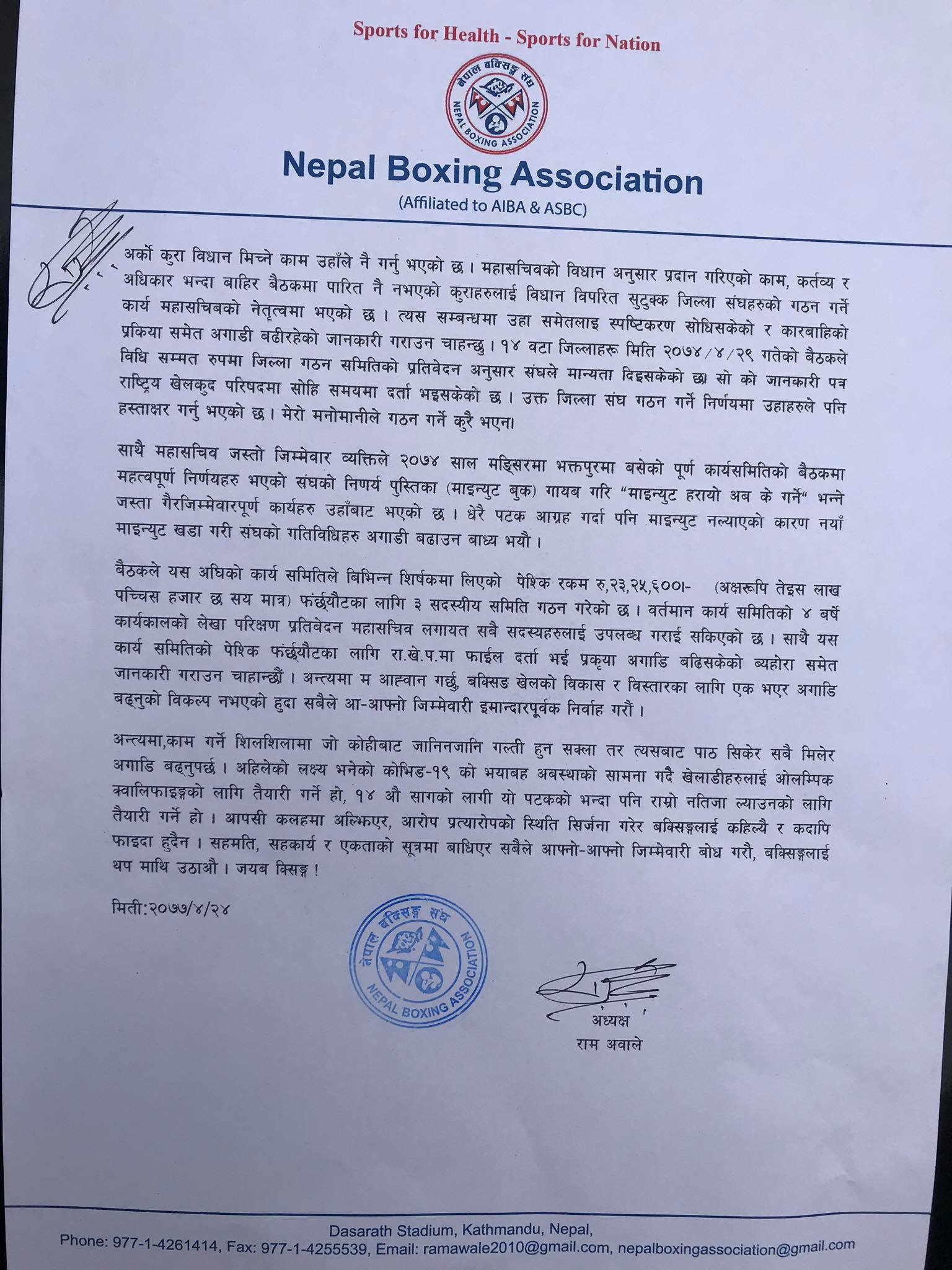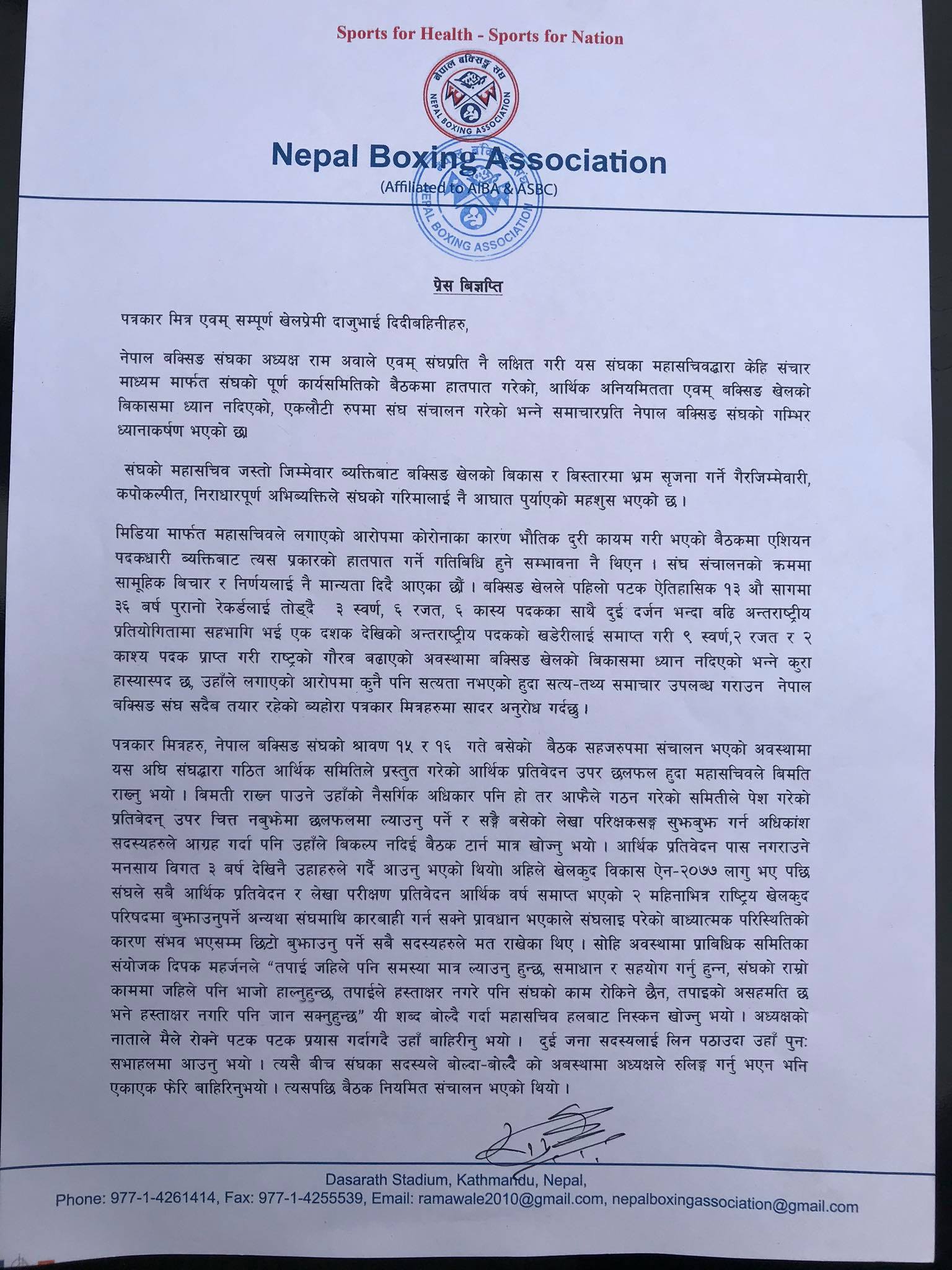संघका अध्यक्ष अवाले एवम् संघप्रति नै लक्षित गरी महासचिवले केही सञ्चार माध्यममार्फत संघको पूर्ण कार्यसमितिको बैठकमा हातपात गरेको, आर्थिक अनियमितता एवम् बक्सिङ खेलको बिकासमा ध्यान नदिएको, एकलौटी रुपमा संघ सञ्चालन गरेको भन्ने समाचारप्रति नेपाल संघको गम्भीर ध्यानाकर्षण भएको विज्ञप्तीमा उल्लेख गरिएको छ ।