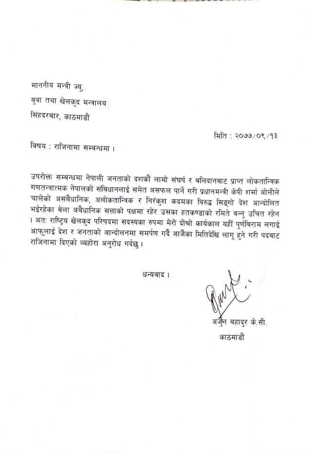 प्रधानमन्त्री केपी शर्मा ओलीले चालेको असंवैधानिक, अलोकतान्त्रिक र निरंकुश कदमका विरुद्ध सिंगो देश आन्दोलित भइरहेको बेला अवैधानिक सत्ताको पक्षमा रहेर रमिते बन्नु उचित रहेन भन्दै राजीनतामा गरेका हुन् ।