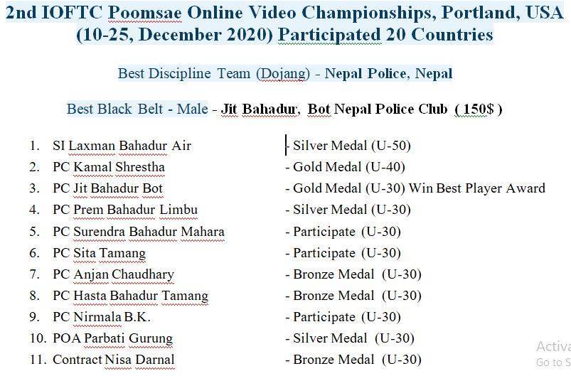 पुलिसका खेलाडीको अन्तर्राष्ट्रिय अनलाईन पुम्से च्याम्पियनसिपमा १३ औं सहभागिता रहेको खेलाडी समेत रहेका प्रशिक्षक लक्ष्मणबहादुर ऐरले जानकारी दिए । सबै खेलाडीको पुम्से प्रदर्शनीको भिडियो खिचेर आयोजकले दिएको लिंकमा अपलोड गरिएको ऐरले बताए ।च्याम्पियनसिपमा २० देशका टोलीको सहभागिता रहेको बताइएको छ ।