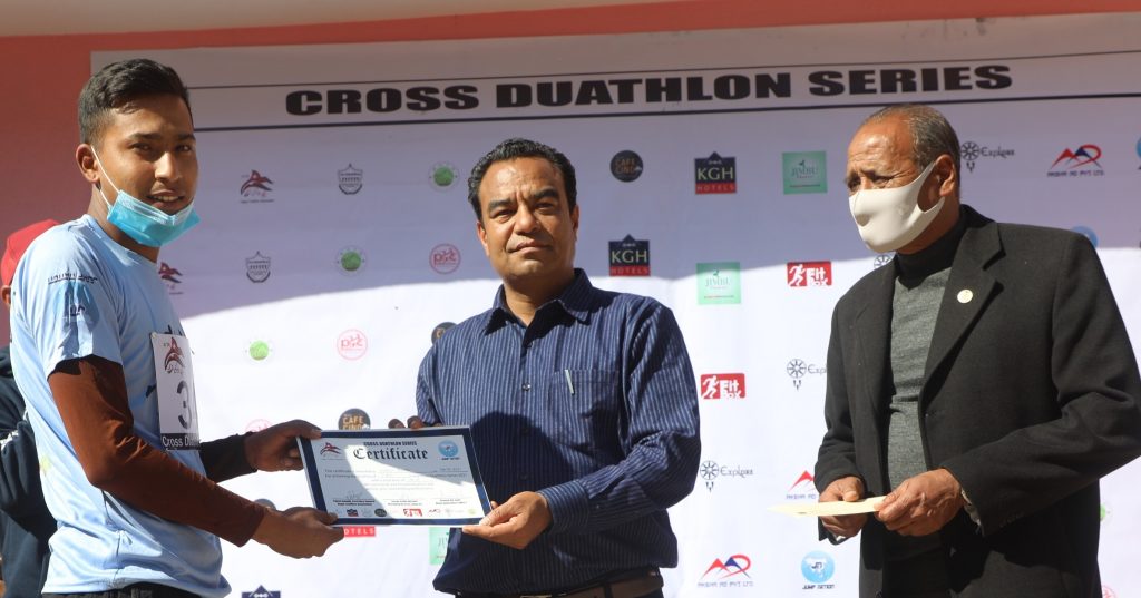 टोखा सहरको गणेश स्थान देखि चण्डेश्वरी सम्म २.५ किमी दौड, १० किमी साईक्लिङ्ग र १.५ किमी दौडको क्रस दुवाथलनको विजयी खेलाडीलाई टोखा नगरपालिका वडा नं. २ का अध्यक्ष दीपक राज जोशीले पुरस्कार वितरण गरे ।